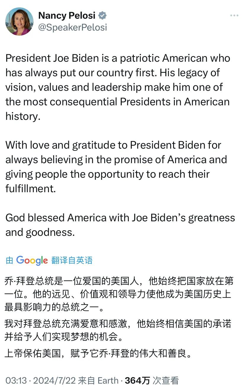 拜登退选后,美国前众议长佩洛西第一时间发文写道:“乔·拜登总统是一位爱国的美国人,他始终把国家放在第一位。他的远见、价值观和领导力使他成为美国历史上最具影响力的总统之一。我对拜登总统充满爱意和感激,他始终相信美国的承诺并给予人们实现梦想的机会。上帝保佑美国,赋予它乔·拜登的伟大和善良。”