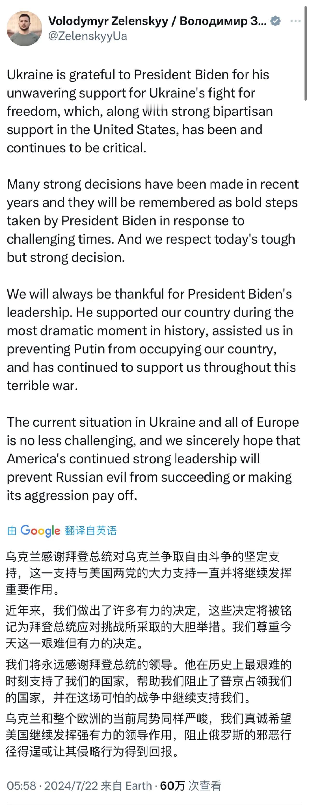 泽连斯基今天(7月22日)写了一大段文字表达对拜登的感谢和尊重,并且特别强调,“乌克兰和整个欧洲的当前局势同样严峻,乌克兰真诚希望美国继续发挥强有力的领导作用,阻止俄罗斯的邪恶行径得逞或让其侵略行为得到回报。”(泽连斯基的全文见图二)