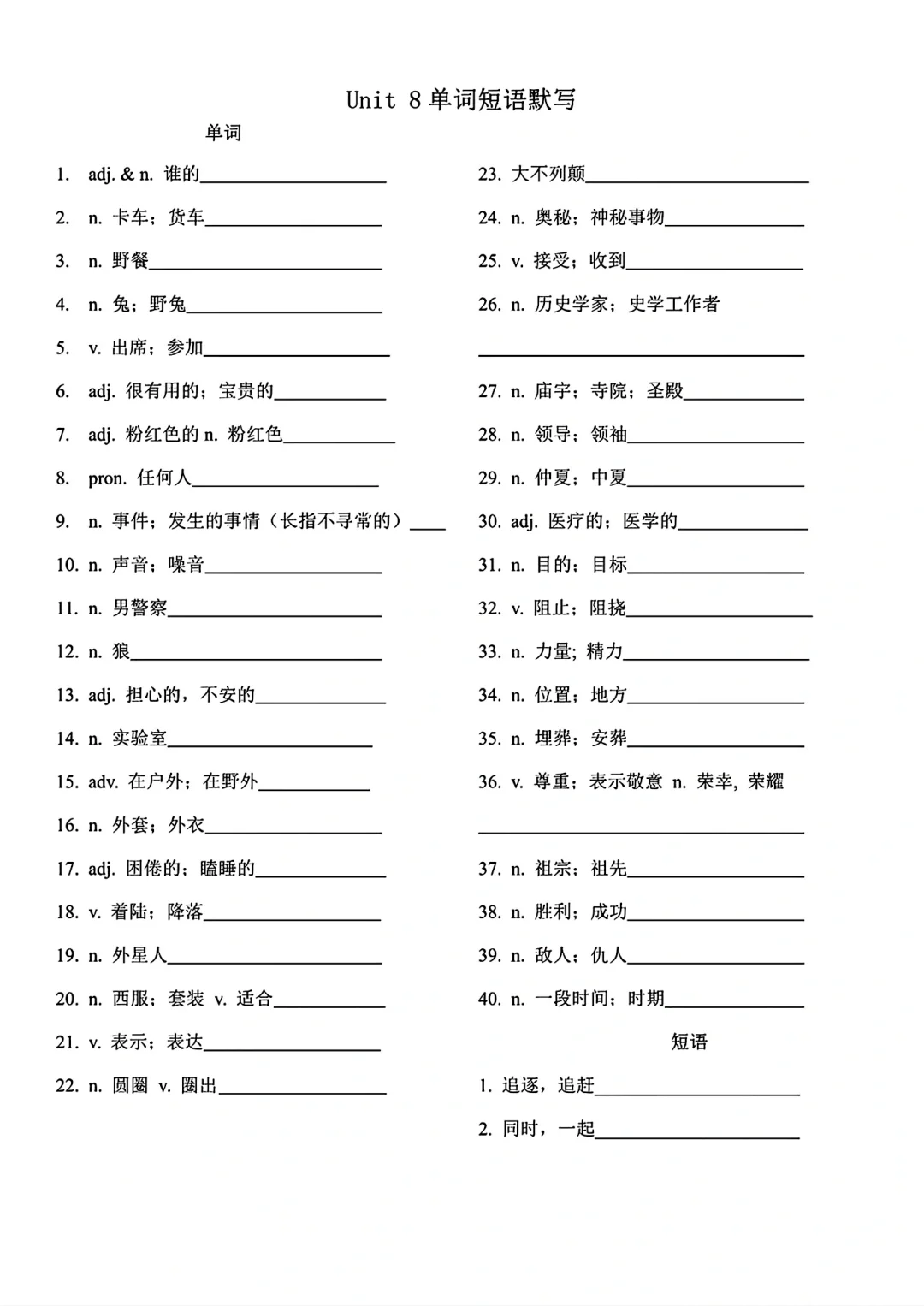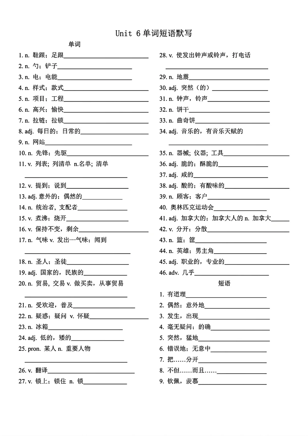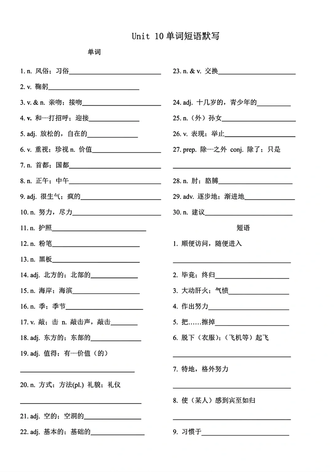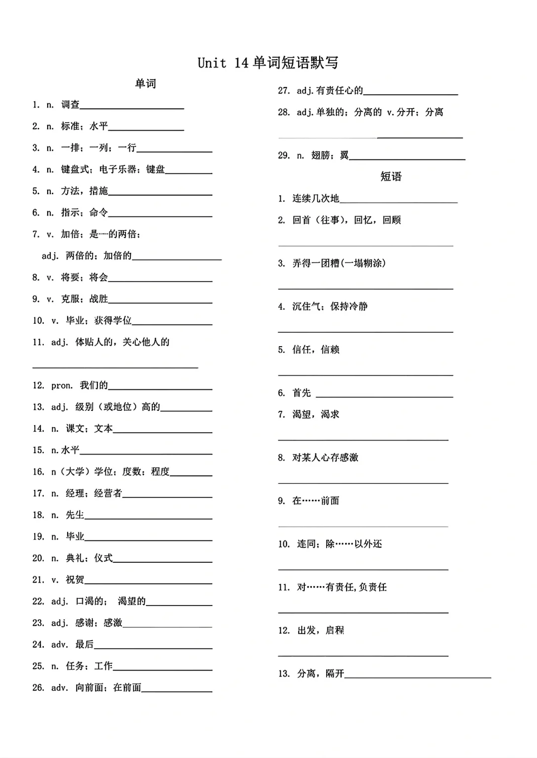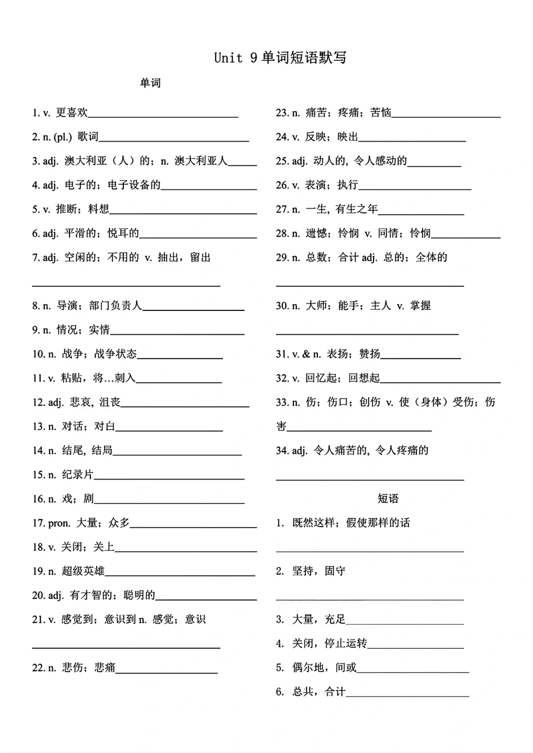 九年级英语单词词语默写