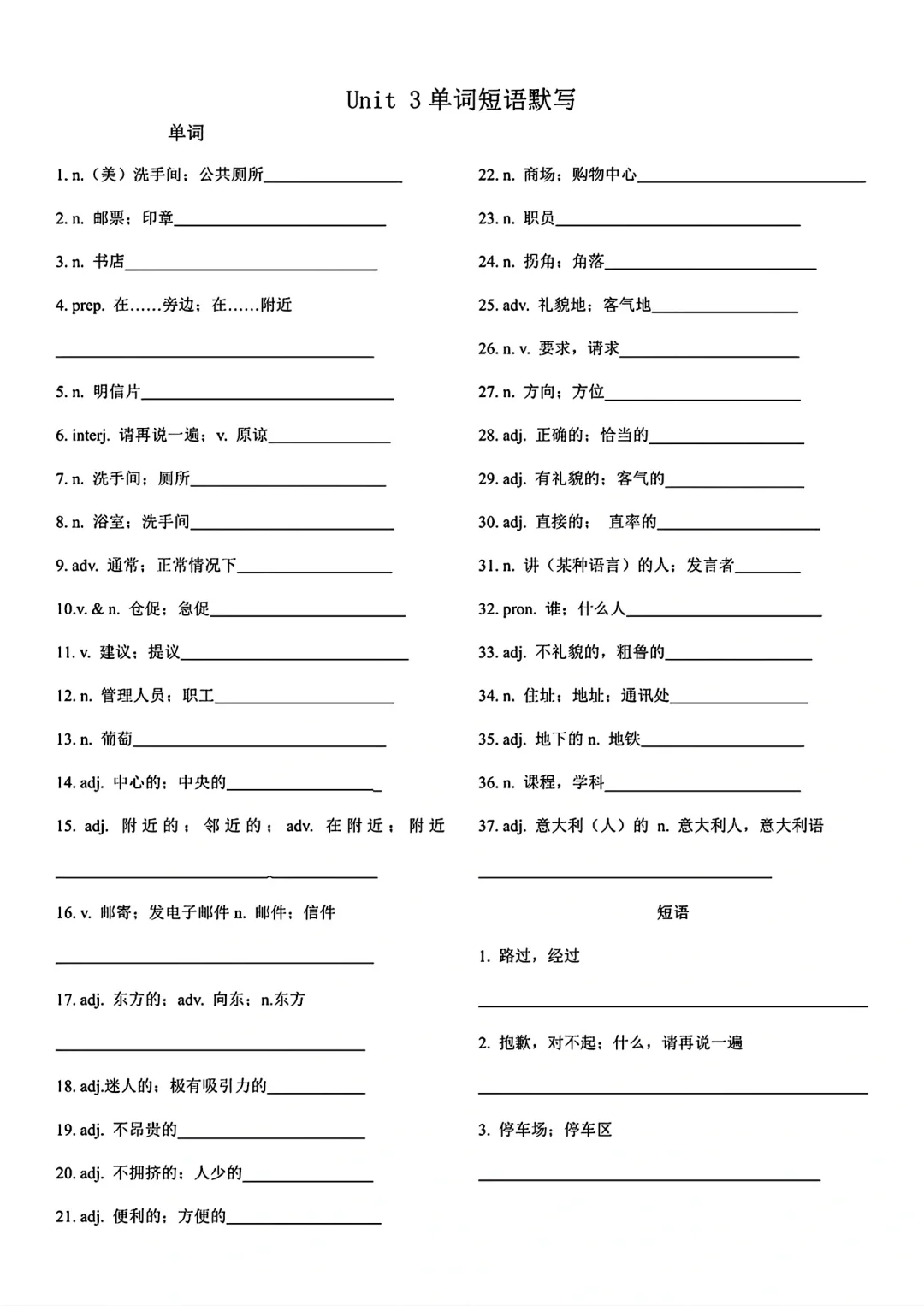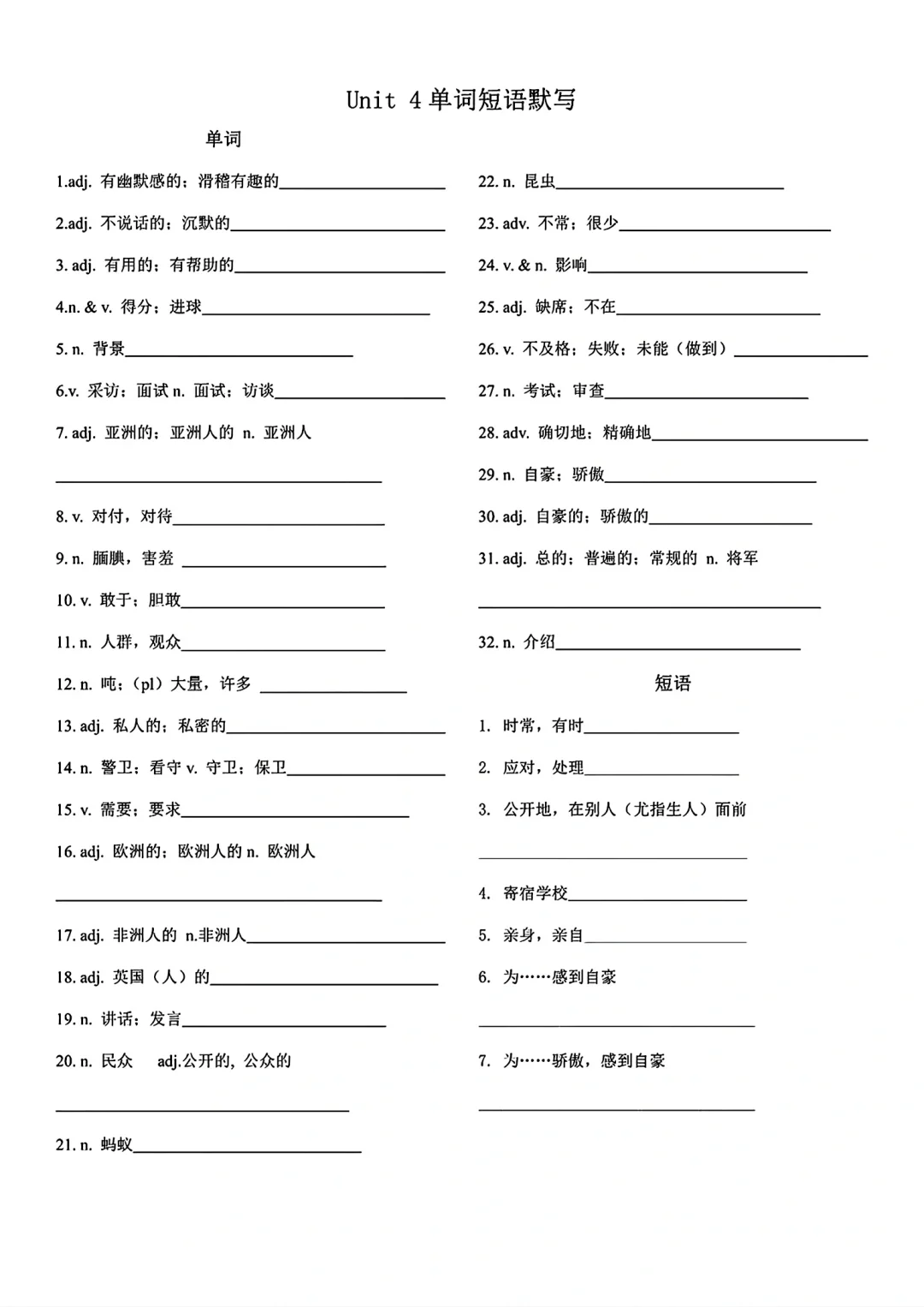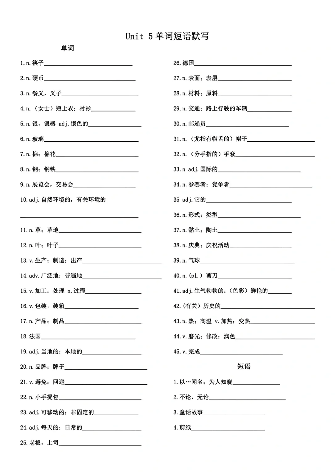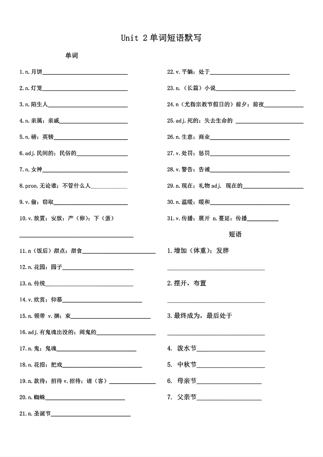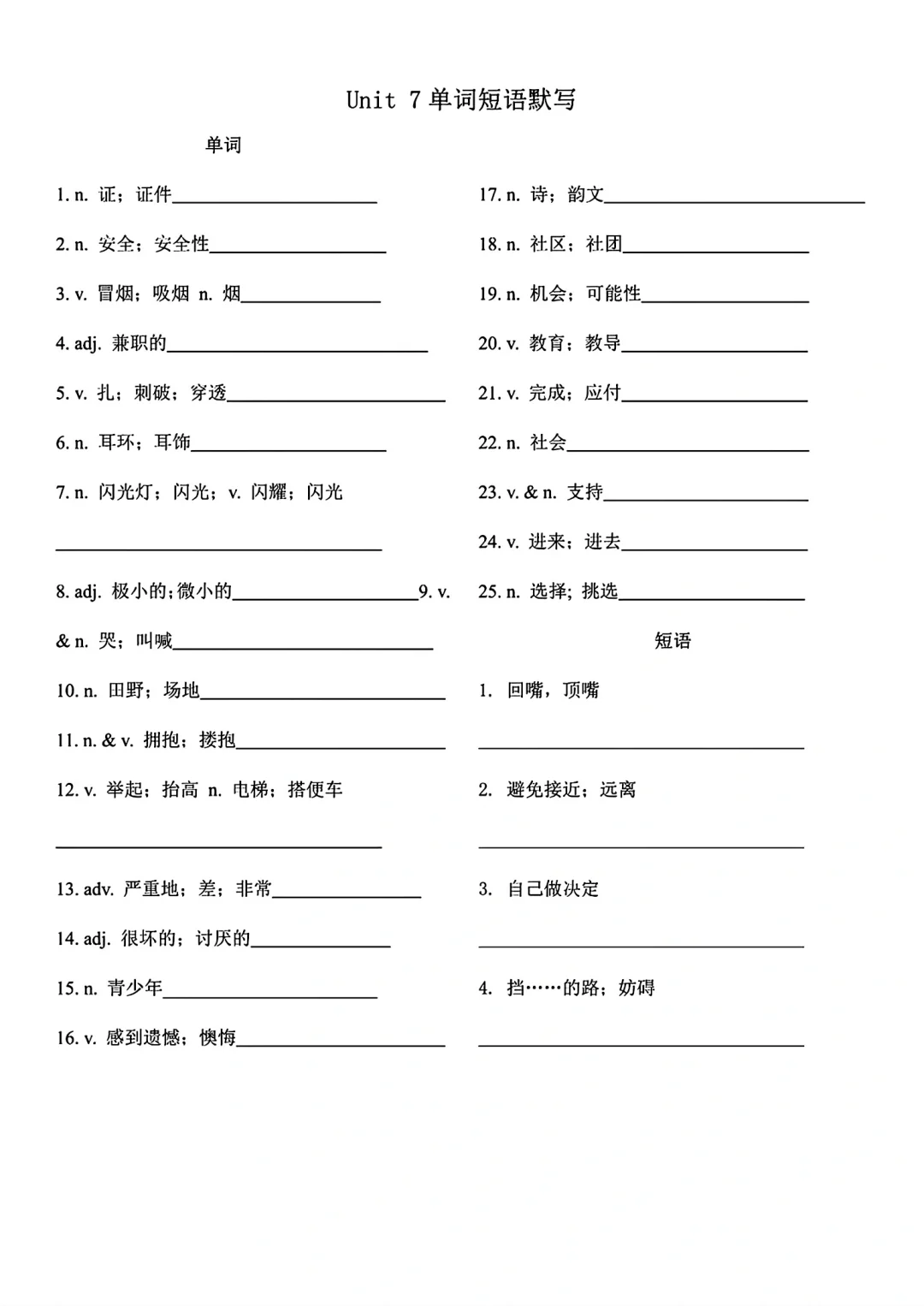 九年级英语单词词语默写