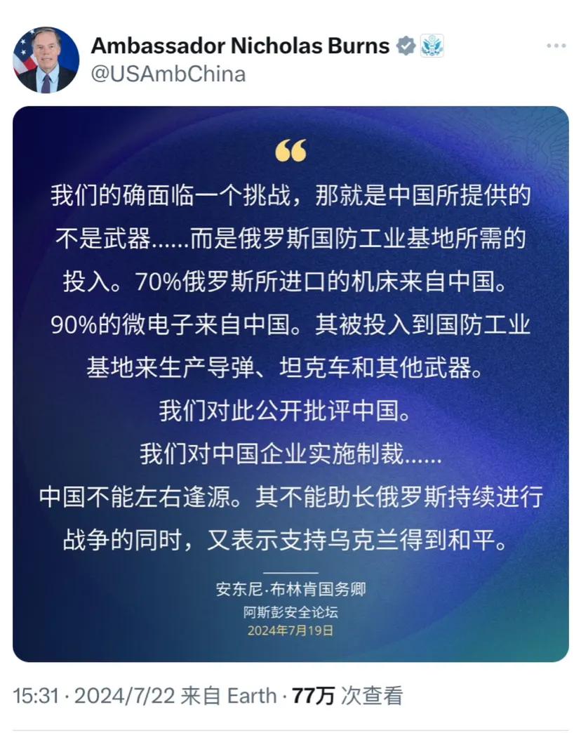 美国驻华大使伯恩斯昨天(7月22日)转发布林肯的涉华言论:“我们的确面临一个挑战,那就是中国所提供的不是武器……而是俄罗斯国防工业基地所需的投入。70%俄罗斯所进口的机床来自中国。90%的微电子来自中国。其被投入到国防工业