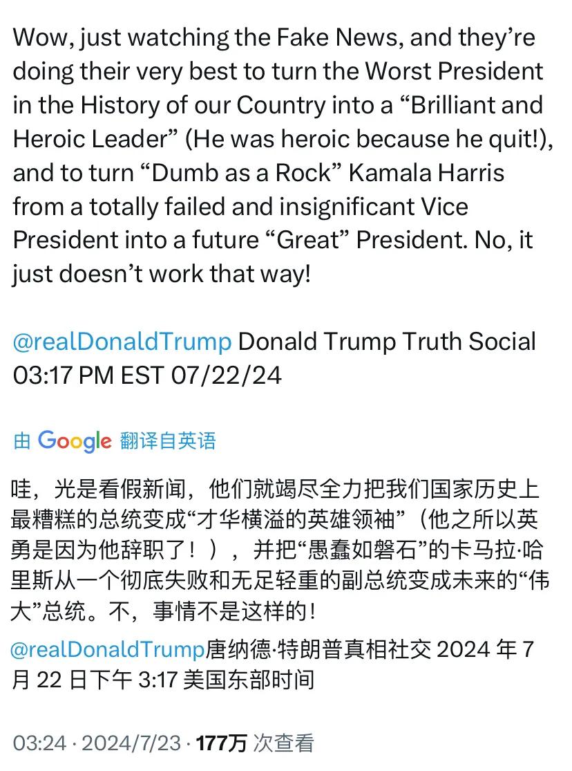 拜登表示自己将全力支持哈里斯之后,特朗普开始猛烈攻击哈里斯。当地时间7月22日,特朗普在真相社交上写道;“哇,光是看假新闻,他们就竭尽全力把我们国家历史上最糟糕的总统变成‘才华横溢的英雄领袖’(他之所以英勇是因为他辞职了!),并把‘愚蠢如顽石’的卡马拉·哈里斯从一个彻底失败和无足轻重的副总统变成未来的‘伟大’总统。不,事情不是这样的!”(见图二)