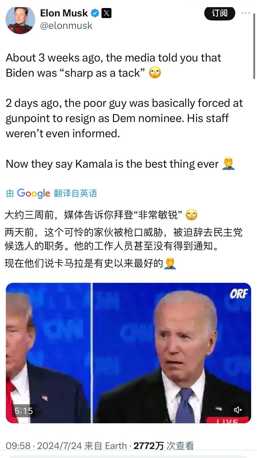 特斯拉的老板马斯克今天(北京时间7月24日)写道:“大约三周前,媒体告诉你拜登‘非常敏锐’ 🙄