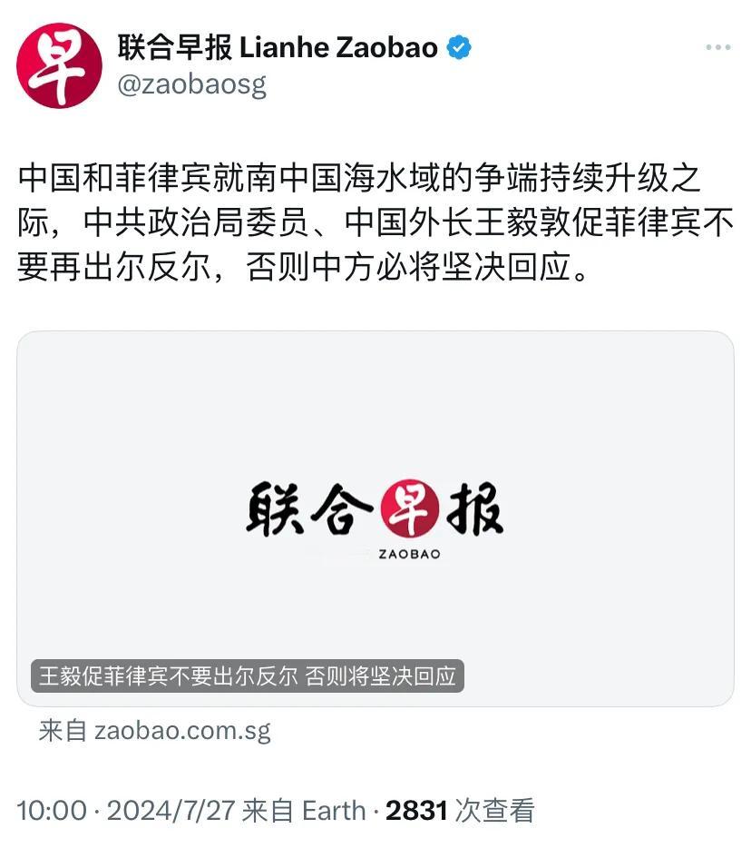 外媒今天(7月27日)报道,“中国和菲律宾就南中国海水域的争端持续升级之际,中国外长王毅敦促菲律宾不要再出尔反尔,否则中方必将坚决回应。”