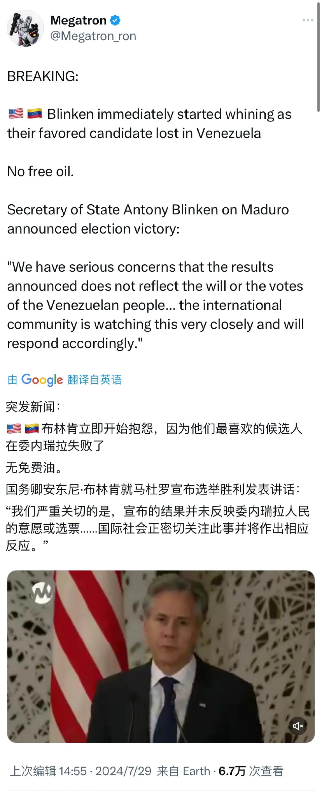 [机智]评几句:就像图二外媒中的评论所说,布林肯抱怨是因为美国最喜欢的候选人在委内瑞拉失败了。接下来,美国可能会拉拢自己的盟友抵制委内瑞拉的选举结果,并质疑本次选举结果的公正性。由于拜登政府现在自顾不暇,可能没有精力再推出一个“瓜伊多”走上前台。但是等到美国大选尘埃落定,哈里斯或特朗普都可能加大对委内瑞拉的制裁力度。