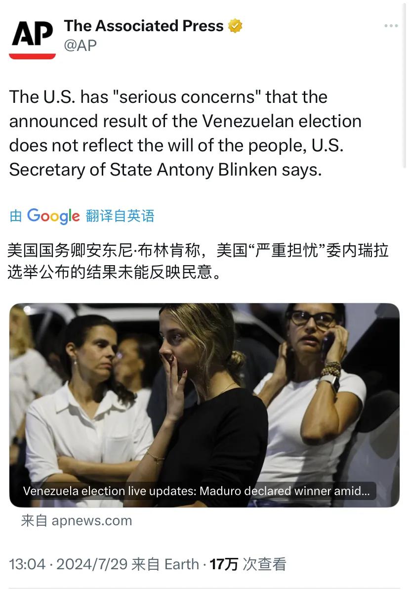 从东京飞往马尼拉前,美国国务卿布林肯就马杜罗宣布成功连任委内瑞拉总统发表讲话:“我们严重关切的是,宣布的结果并未反映委内瑞拉人民的意愿或选票……国际社会正密切关注此事并将作出相应反应。”
