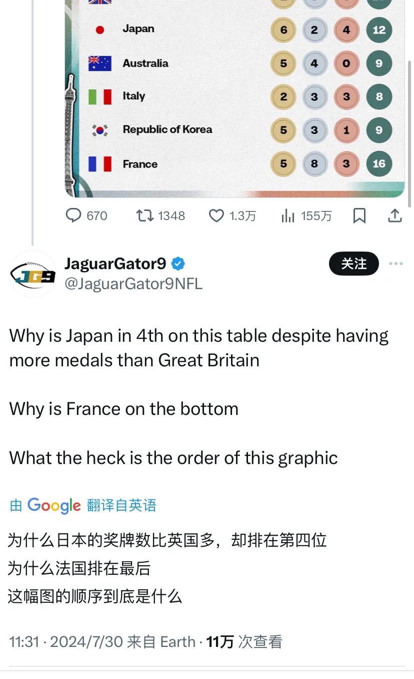 有网民在留言区提问:“为什么日本的奖牌数比英国多,却排在第四位?为什么法国排在最后?这幅图的顺序到底是什么?”