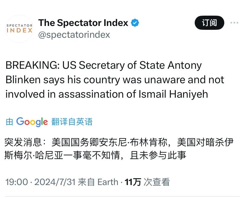 突发消息:美国国务卿安东尼·布林肯称,美国对暗杀伊斯梅尔·哈尼亚一事毫不知情,且未参与此事。