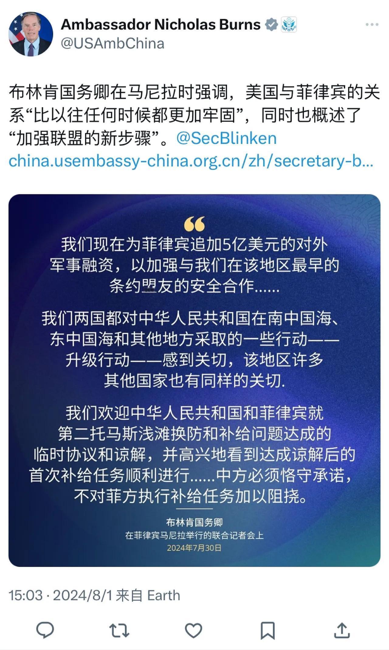 【伯恩斯转发了布林肯在马尼拉的讲话:“我们现在为菲律宾追加5亿美元的对外军事融资,以加强与我们在该地区最早的条约盟友的安全合作……我们两国都对中华人民共和国在南中国海、东中国海和其他地方采取的一些行动——升级行动——感到关切,该地区许多其他国家也有同样的关切……我们欢迎中华人民共和国和菲律宾就第二托马斯浅滩(仁爱礁)换防和补给问题达成的临时协议和谅解,并高兴地看到达成谅解后的首次补给任务顺利进行……中方必须恪守承诺,不对菲方执行补给任务加以阻。”】