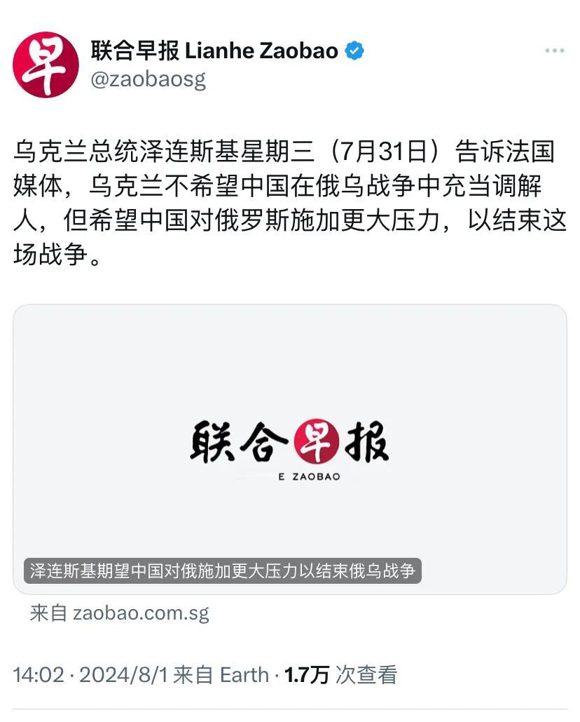 外媒:乌克兰总统泽连斯基7月31日告诉法国媒体,乌克兰不希望中国在俄乌战争中充当调解人,但希望中国对俄罗斯施加更大压力,以结束这场战争。