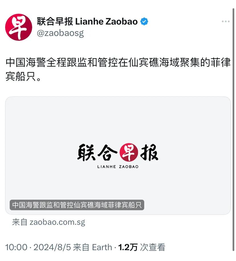 新加坡联合早报今天(8月5日)报道:“中国海警全程跟监和管控在仙宾礁海域聚集的菲律宾船只。”