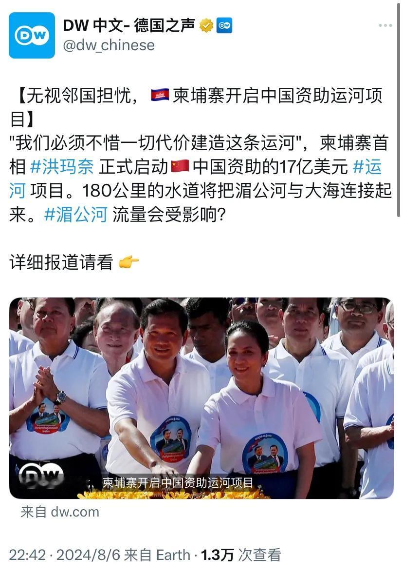 德国之声昨晚(8月6日晚)写道:“【无视邻国担忧,柬埔寨开启中国资助运河项目】‘我们必须不惜一切代价建造这条运河’,柬埔寨首相洪玛奈正式启动中国资助的17亿美元运河项目。180公里的水道将把湄公河与大海连接起来。湄公河流量会受影响?”