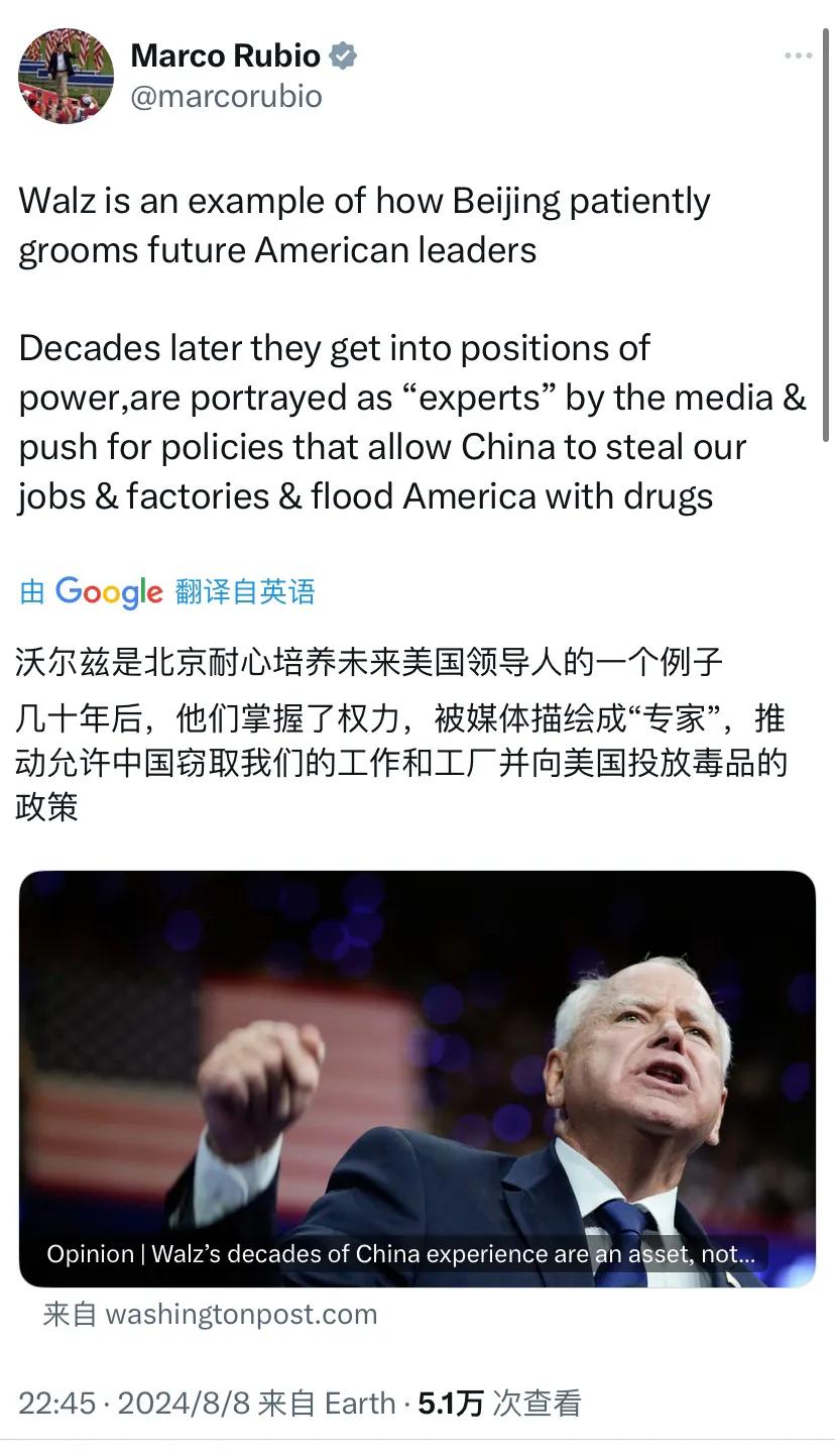 【卢比奥转发了华盛顿邮报的评论文章:沃尔兹几十年的中国经验是一笔财富,而不是一笔负债 】