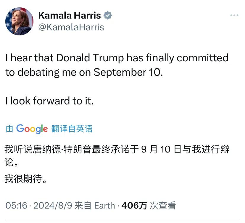美国副总统哈里斯今天(北京时间8月9日)写道:“我听说唐纳德·特朗普最终承诺于 9 月 10 日与我进行辩论。我很期待。” [机智]哈里斯目前在大多数主要民调中都领先着特朗普。面对来势汹汹的哈里斯,特朗普正试图夺回被哈里斯抢走的风头。