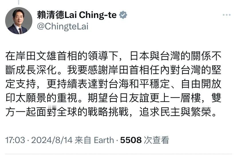 赖清德今天(8月14日)写道:“在岸田文雄首相的领导下,日本与台湾的关系不断成长深化。我要感谢岸田首相任内对台湾的坚定支持,更持续表达对台海和平稳定、自由开放印太愿景的重视。期望台日友谊更上一层楼,双方一起面对全球的战略挑战,追求民主与繁荣。”