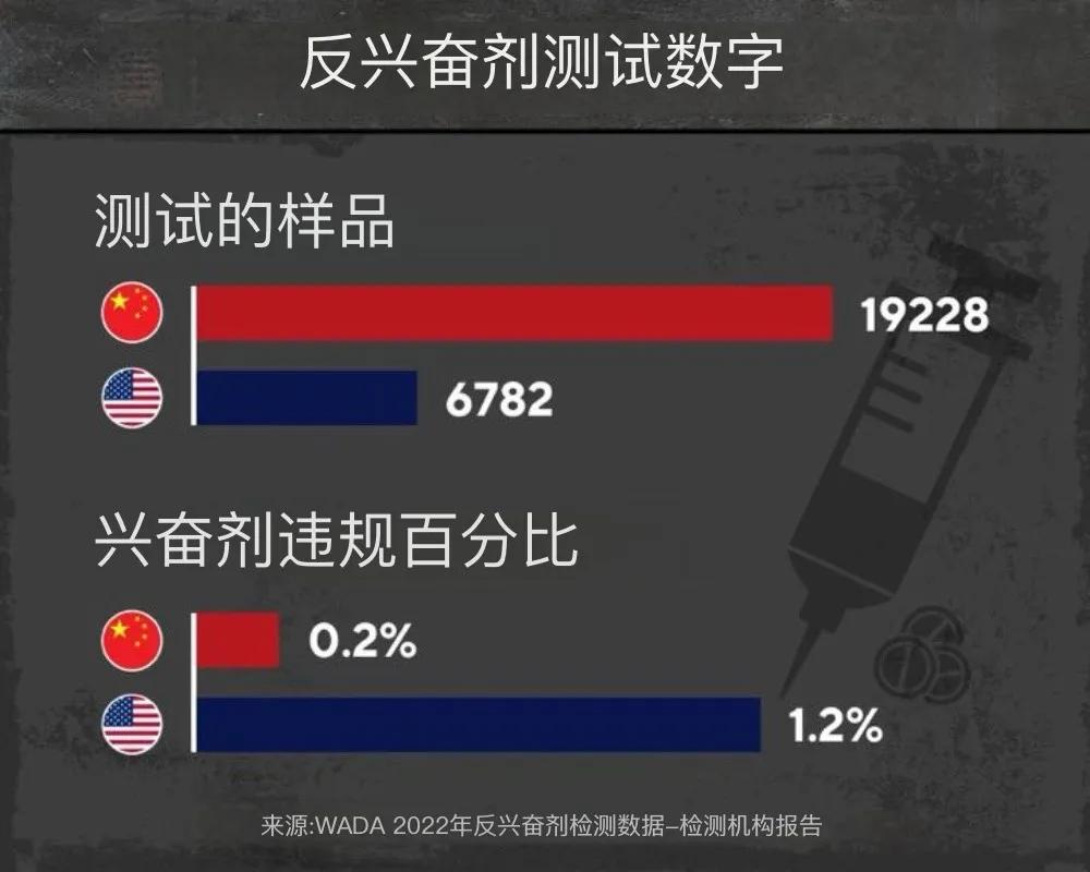 中国的兴奋剂违规百分比为0.2%,美国为1.2%。——数据来源为世界反兴奋剂组织2022年反兴奋剂检测数据报告。”