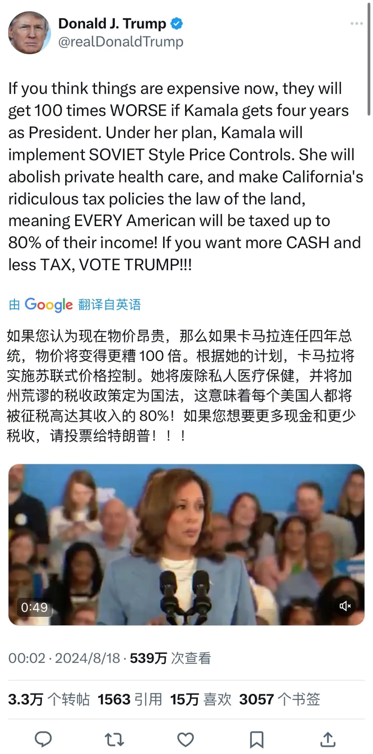 回到X(前推特)之后,特朗普今天火力全开,直接攻击卡马拉·哈里斯:“如果您认为现在物价昂贵,那么如果卡马拉连任四年总统,物价将变得更糟 100 倍。根据她的计划,卡马拉将实施苏联式价格控制。她将废除私人医疗保健,并将加州荒谬的税收政策定为国法,这意味着每个美国人都将被征税高达其收入的 80%!如果您想要更多现金和更少税收,请投票给特朗普!!!”