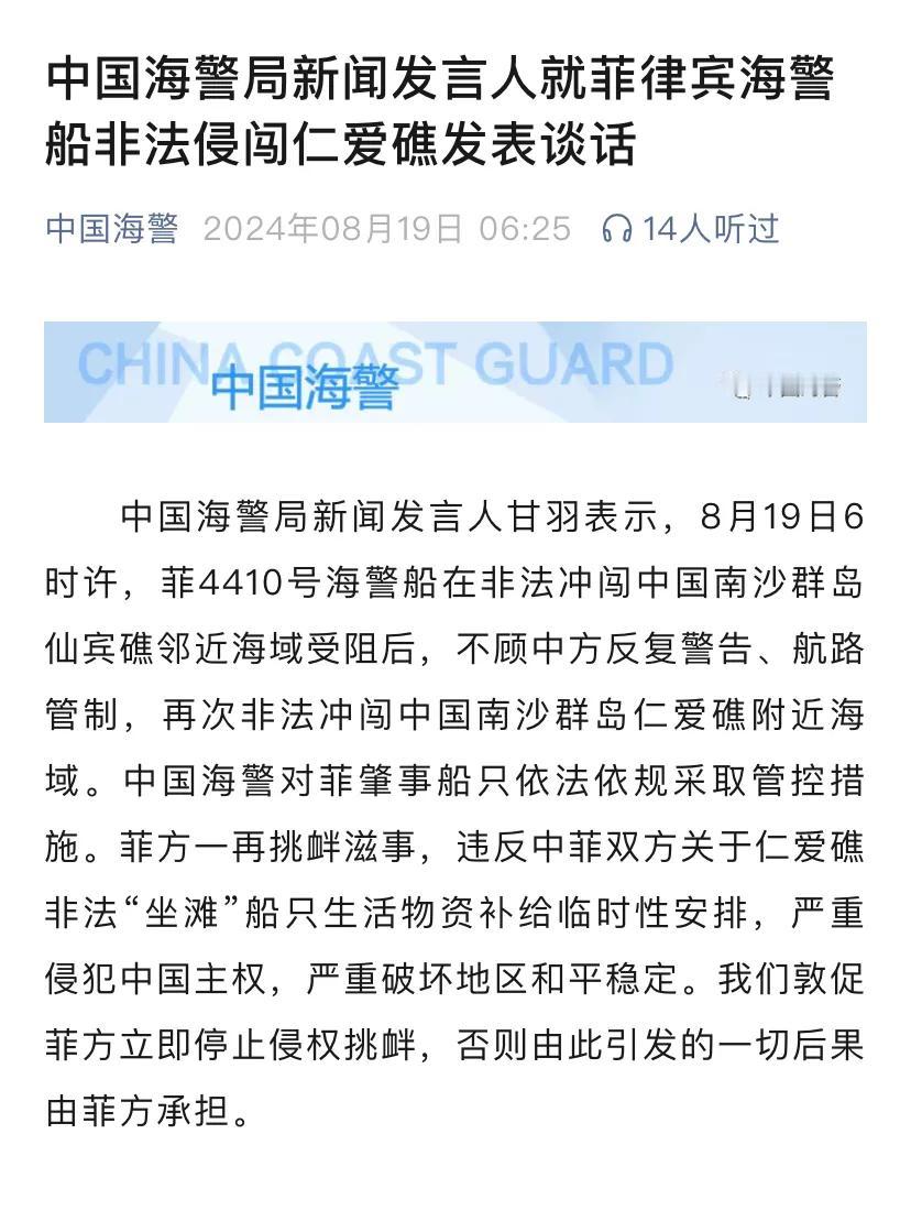 [机智]面对菲律宾方面的频繁挑衅,面对菲律宾妄图在仙宾礁复制仁爱礁式的非法“坐滩”,我海警必须坚决捍卫国家主权安全和领土完整。中国领土领海,神圣不容侵犯!