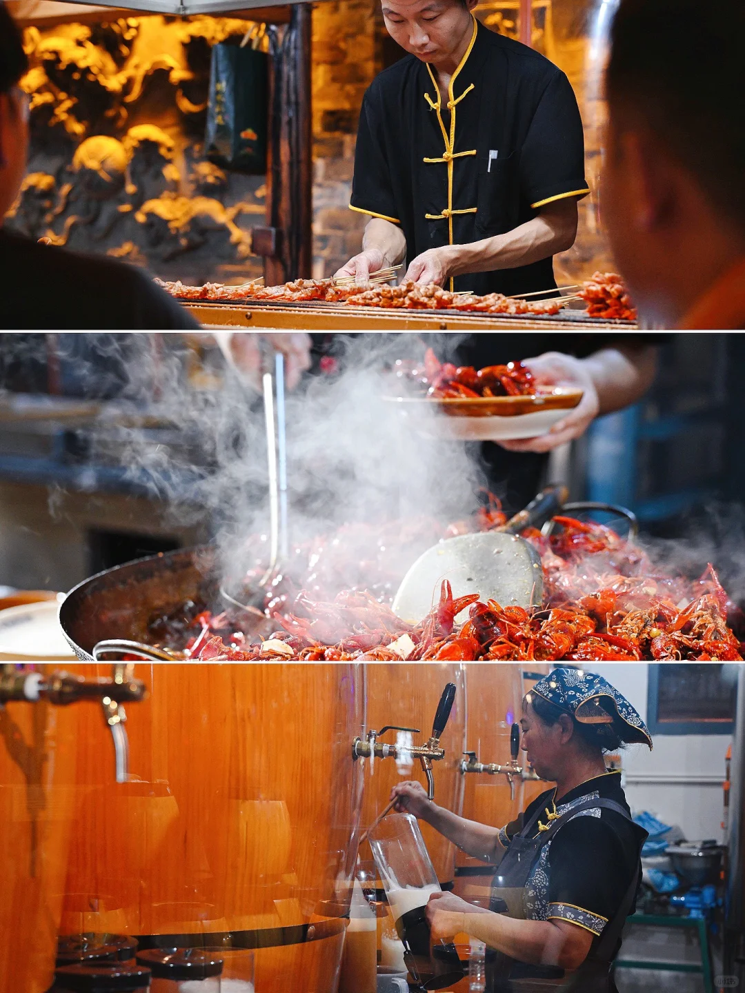 晚上有小龙虾、烧烤和精酿啤酒,还有很多小吃,也可以点菜