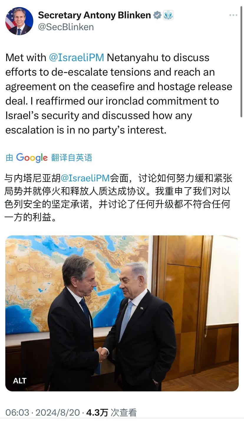 美国国务卿布林肯刚刚(北京时间8月20日6:03)写道:“与以色列总理内塔尼亚胡会面,讨论如何努力缓和紧张局势并就停火和释放人质达成协议。我重申了我们对以色列安全的坚定承诺,并讨论了任何升级都不符合任何一方的利益。”