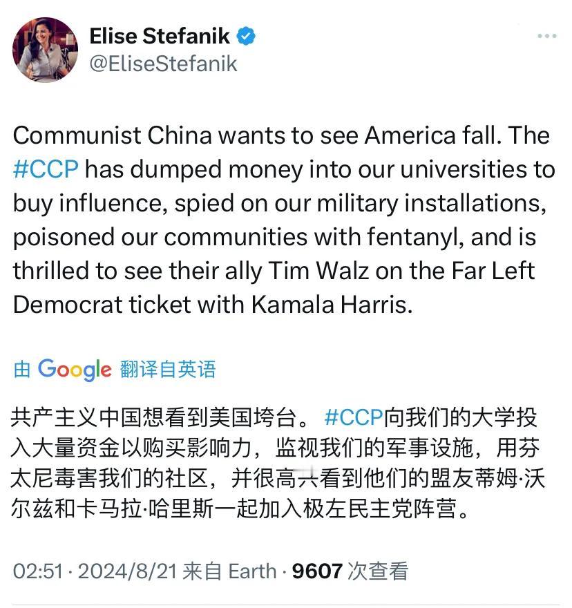 美国共和党籍众议员埃莉斯·斯特法尼克今天(北京时间8月21日)叫嚣道:“中国希望看到美国沦陷。中国向我们的大学倾资购买影响力,监视我们的军事设施,用芬太尼毒害我们的社区,并且很高兴看到他们的盟友蒂姆·沃尔兹与卡马拉·哈里斯一起加入极左民主党阵营。”