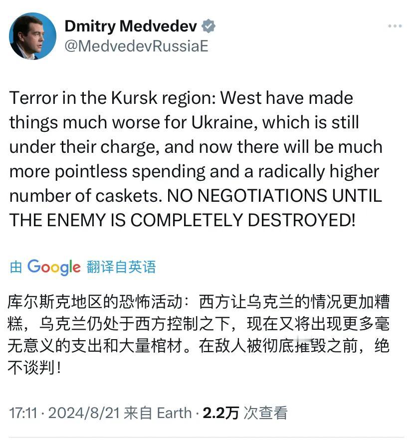 梅德韦杰夫刚刚写道:“库尔斯克地区的恐怖活动:西方让乌克兰的情况更加糟糕,乌克兰仍处于西方控制之下,现在又将出现更多毫无意义的支出和大量棺材。在敌人被彻底摧毁之前,绝不谈判!”
