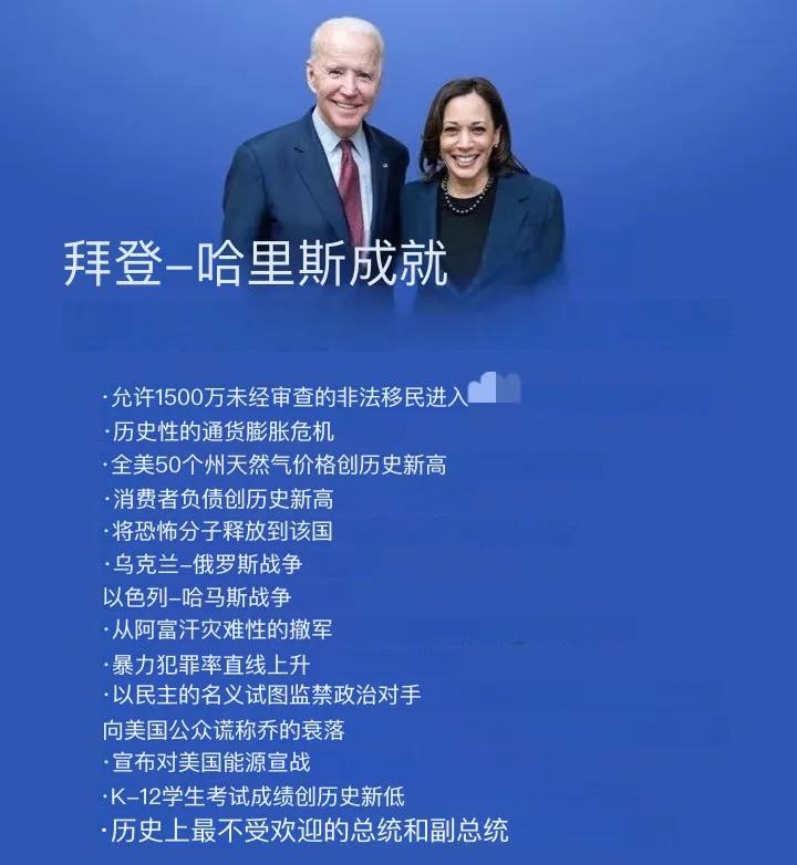 针对哈里斯的言论,特朗普今天回击道:“拜登-哈里斯的成就: