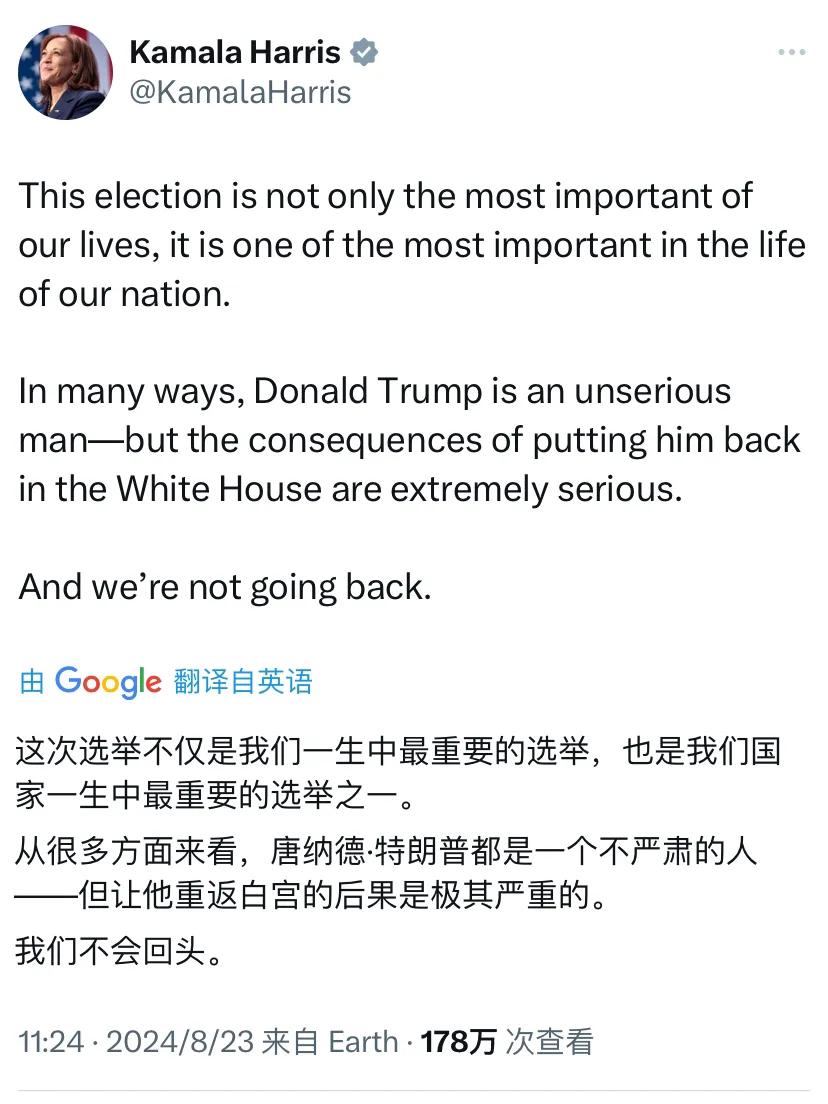 哈里斯今天写道:“这次选举不仅是我们一生中最重要的选举,也是我们国家一生中最重要的选举之一。从很多方面来看,唐纳德·特朗普都是一个不严肃的人——但让他重返白宫的后果是极其严重的。我们不会回头。”