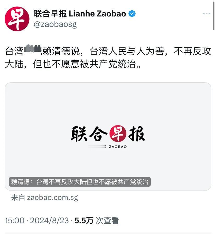 外媒今天报道,赖清德妄言道,“台湾人民与人为善,不再反攻大陆,但也不愿意被共产党统治。”
