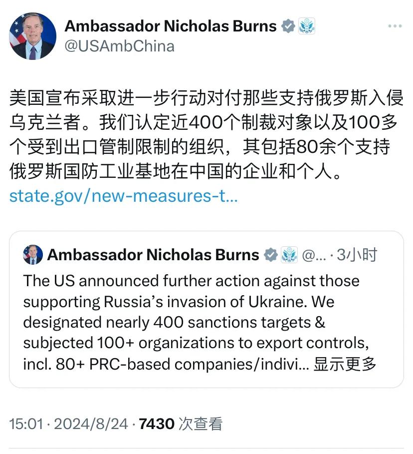 美国驻华大使伯恩斯今天写道:“美国宣布采取进一步行动对付那些支持俄罗斯入侵乌克兰者。我们认定近400个制裁对象以及100多个受到出口管制限制的组织,其包括80余个支持俄罗斯国防工业基地在中国的企业和个人。”