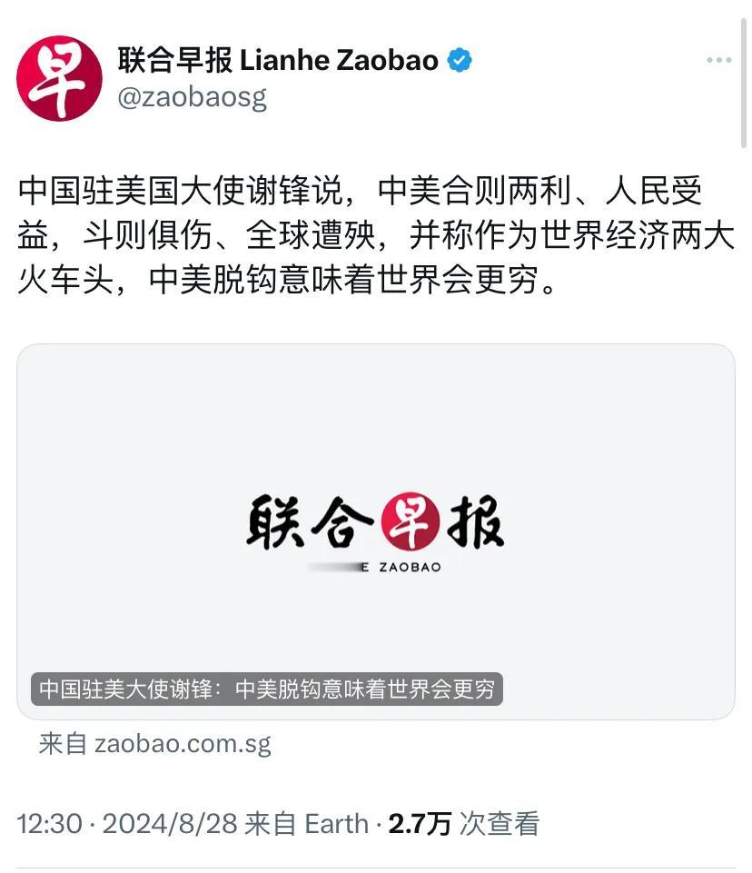 新加坡联合早报今天报道:“中国驻美国大使谢锋说,中美合则两利、人民受益,斗则俱伤、全球遭殃,并称作为世界经济两大火车头,中美脱钩意味着世界会更穷。”