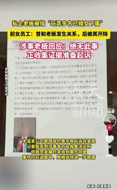 私企老板被指“玩弄多名已婚女下属”,前女员工:曾和老板发生关系,后被其开除。涉事老板回应:绝无此事,正收集证据准备起诉!