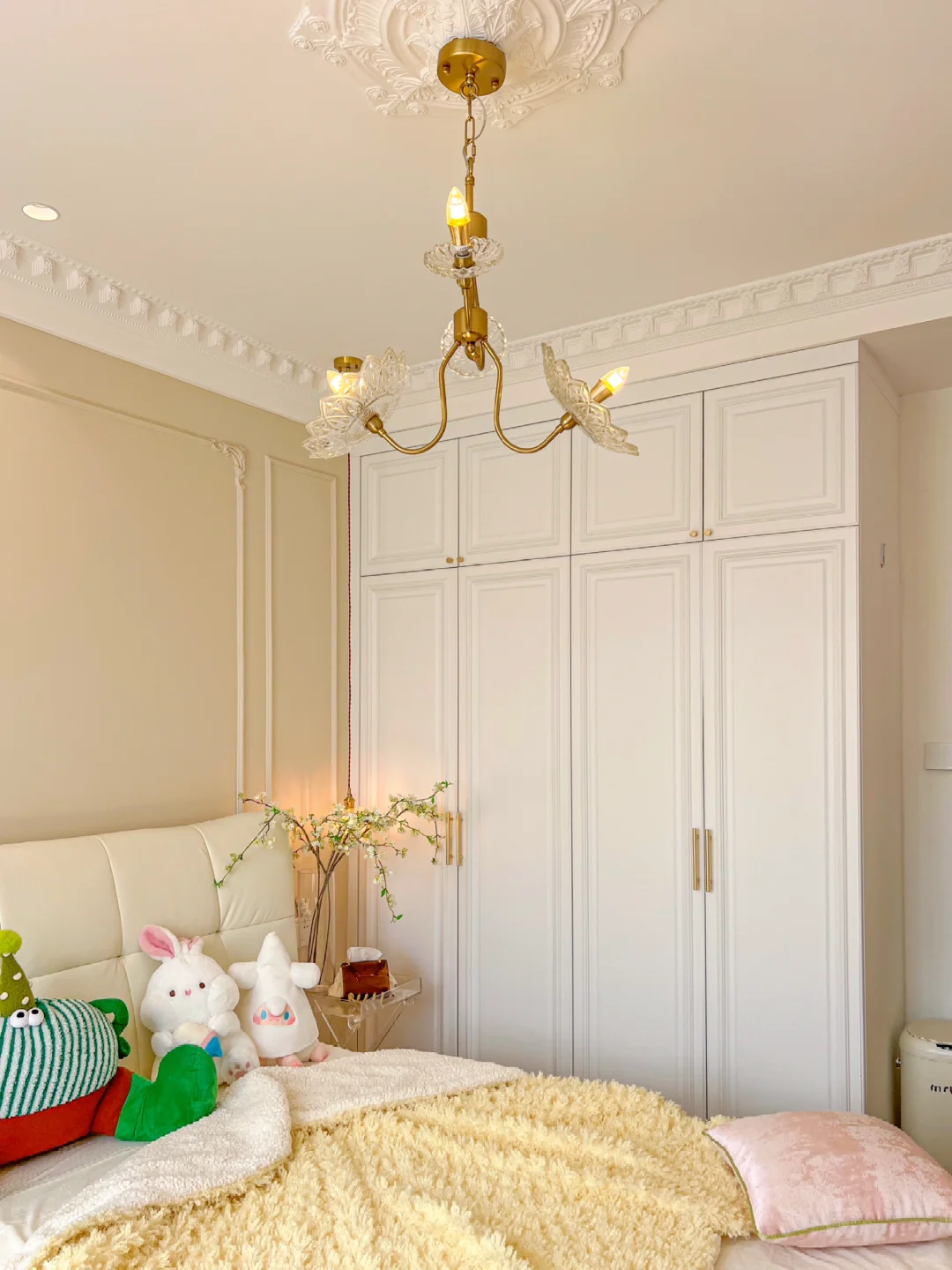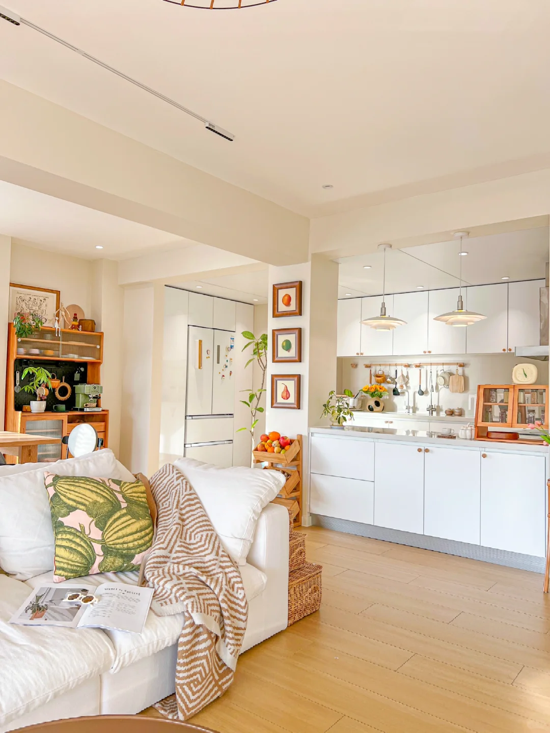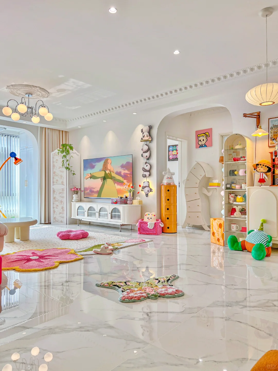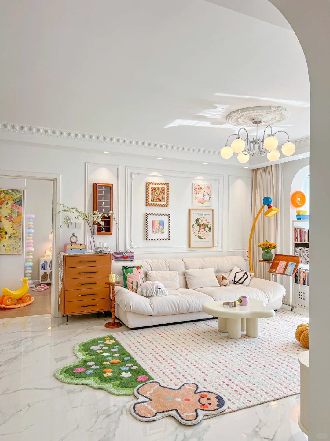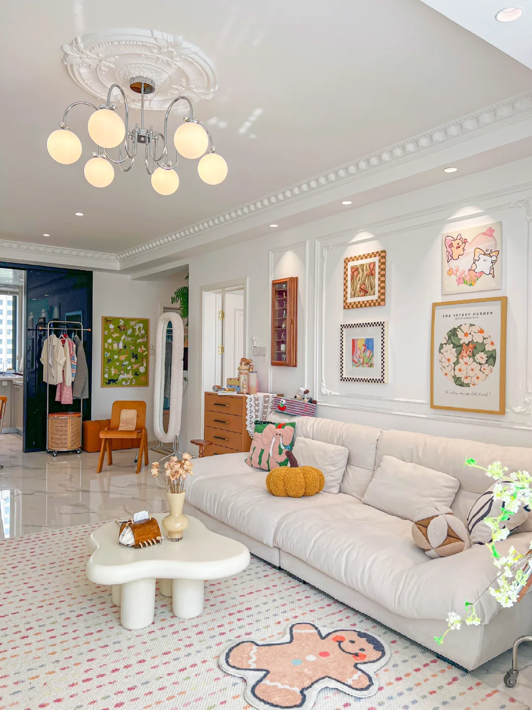 ▪️软装: 以浅色为主,白色沙发、银白色蝴蝶结吊灯、白色柜子等,搭配彩色小件软装,鲜花绿植加以点缀,让家里更加活泼有趣