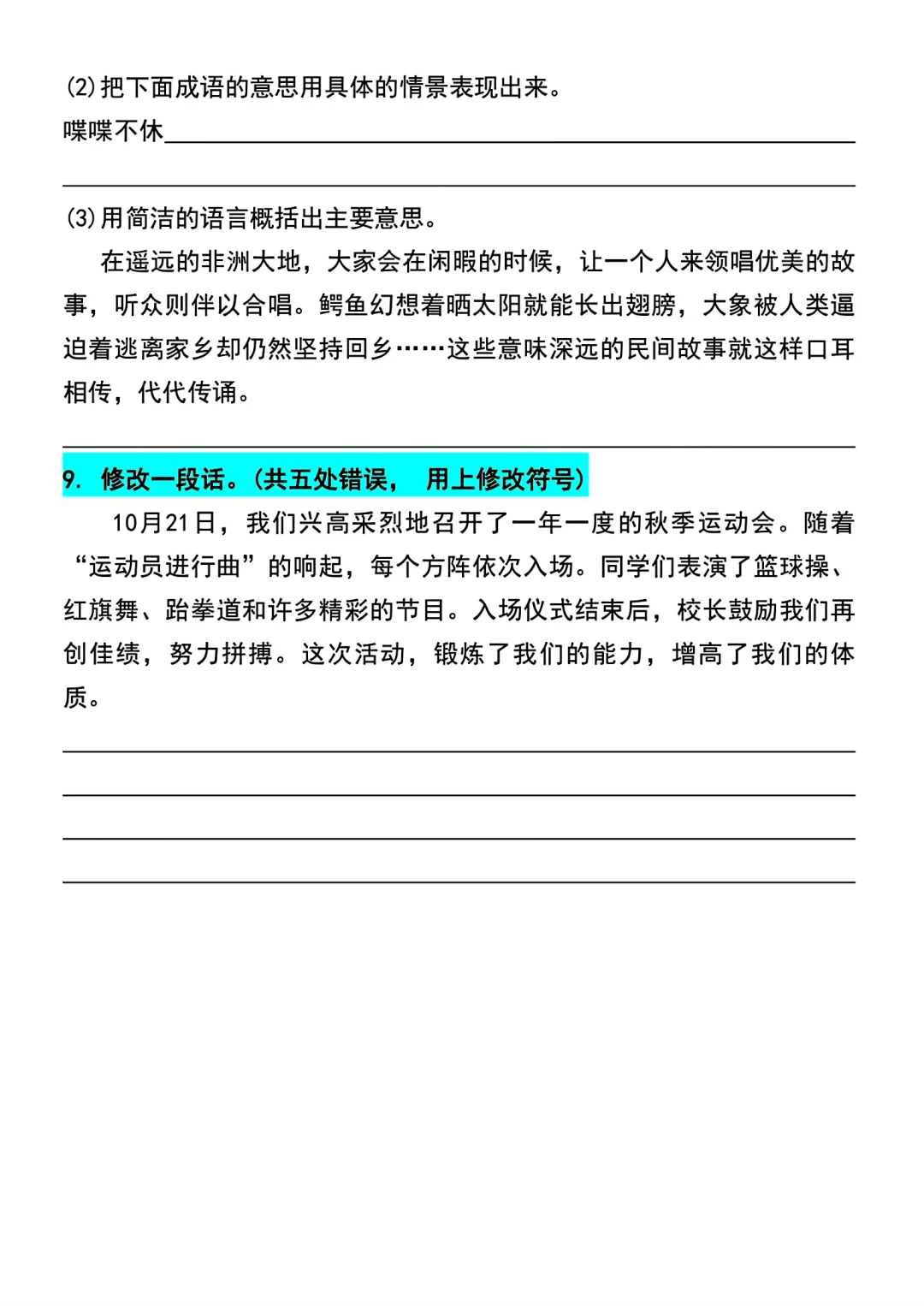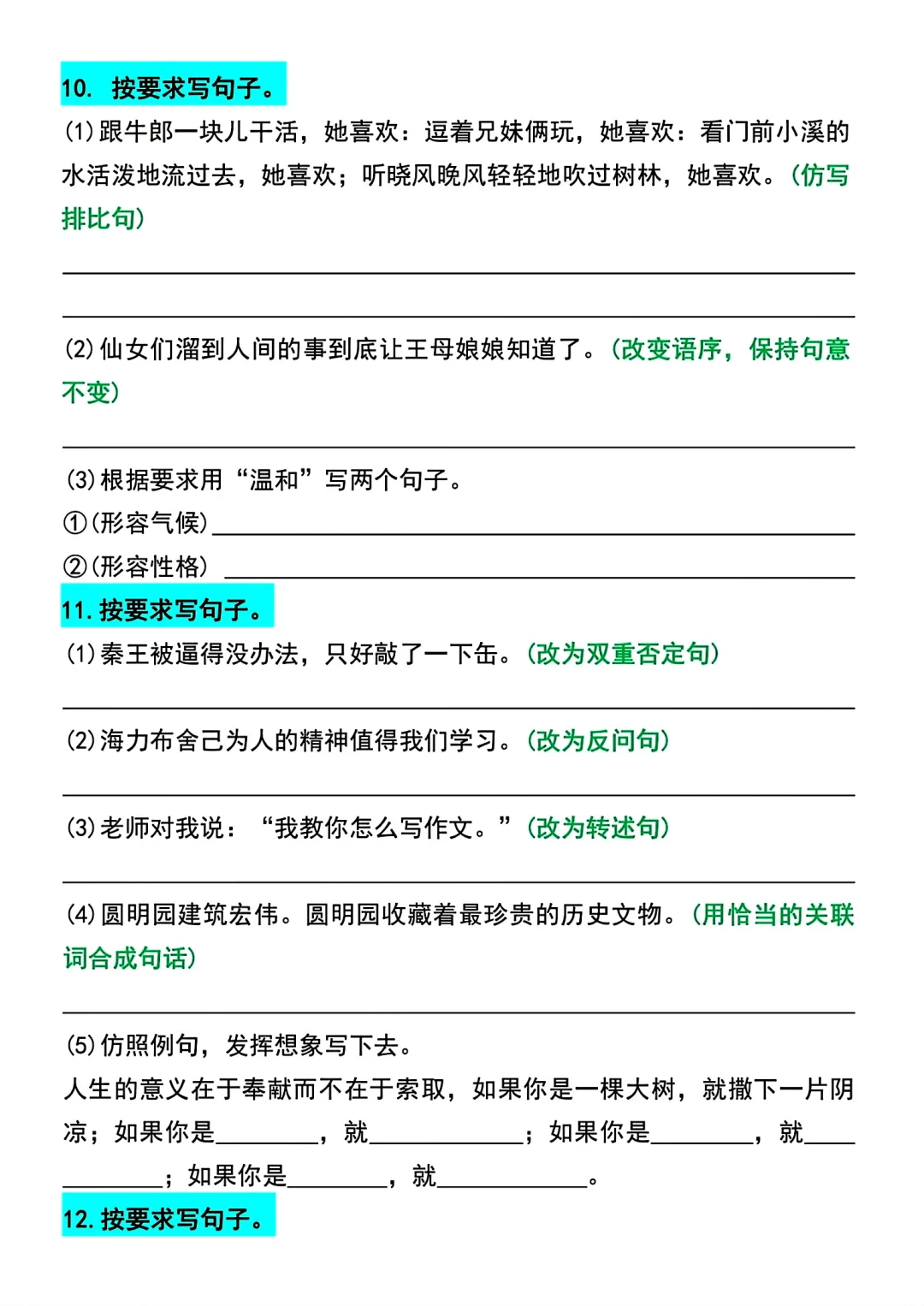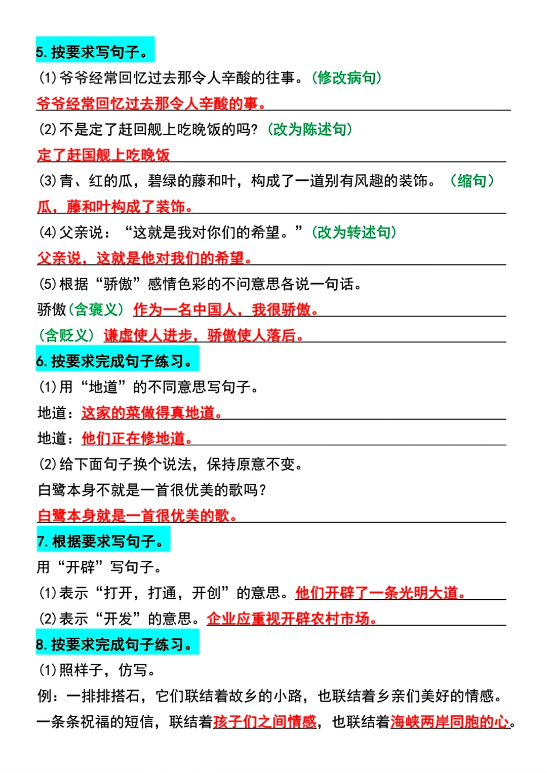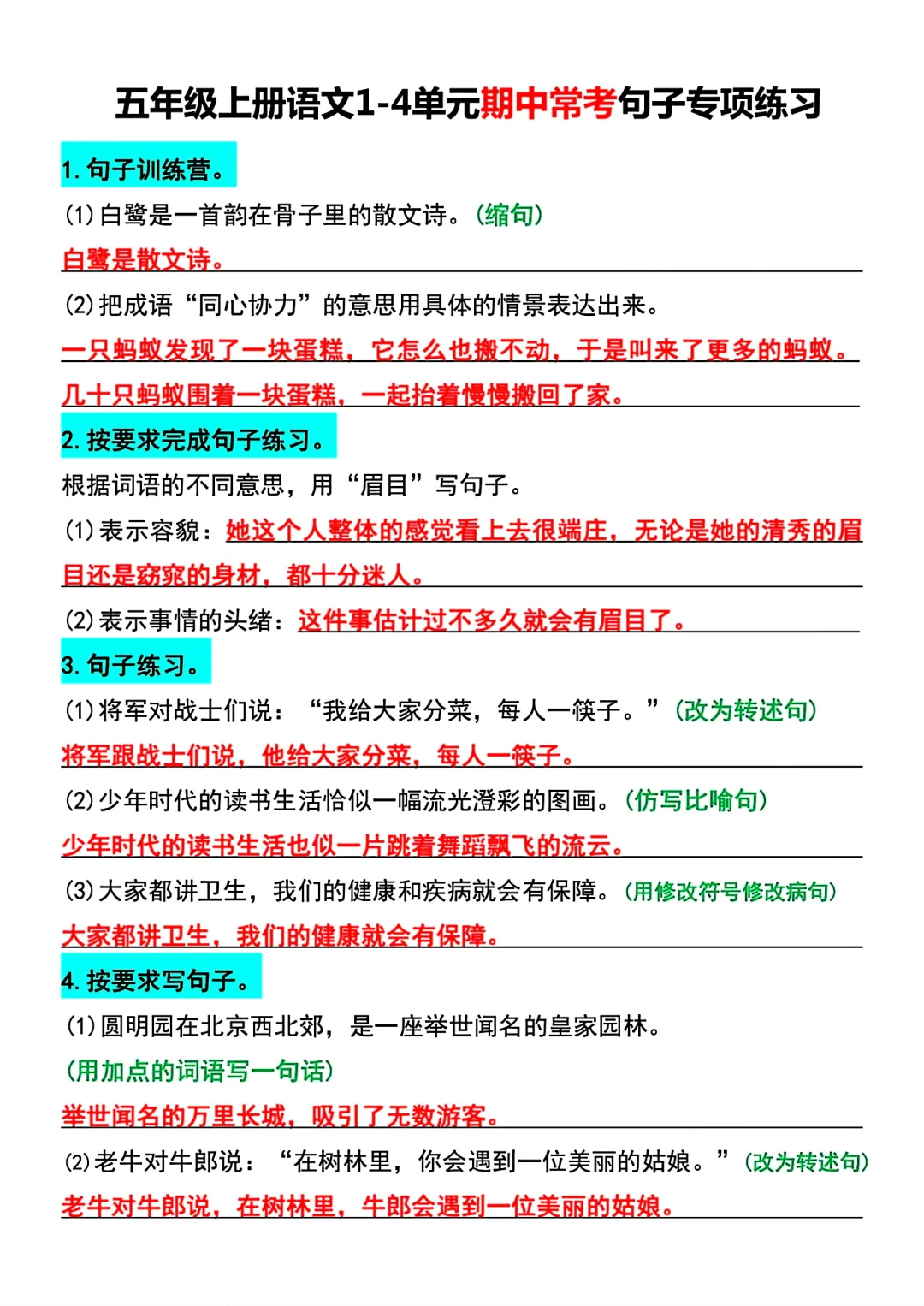 五年级上册语文1~4单元期中常考句子专项练习,只有1~4单元的,有答案加答案共十页pdf,随机配一些其他的的学习资料