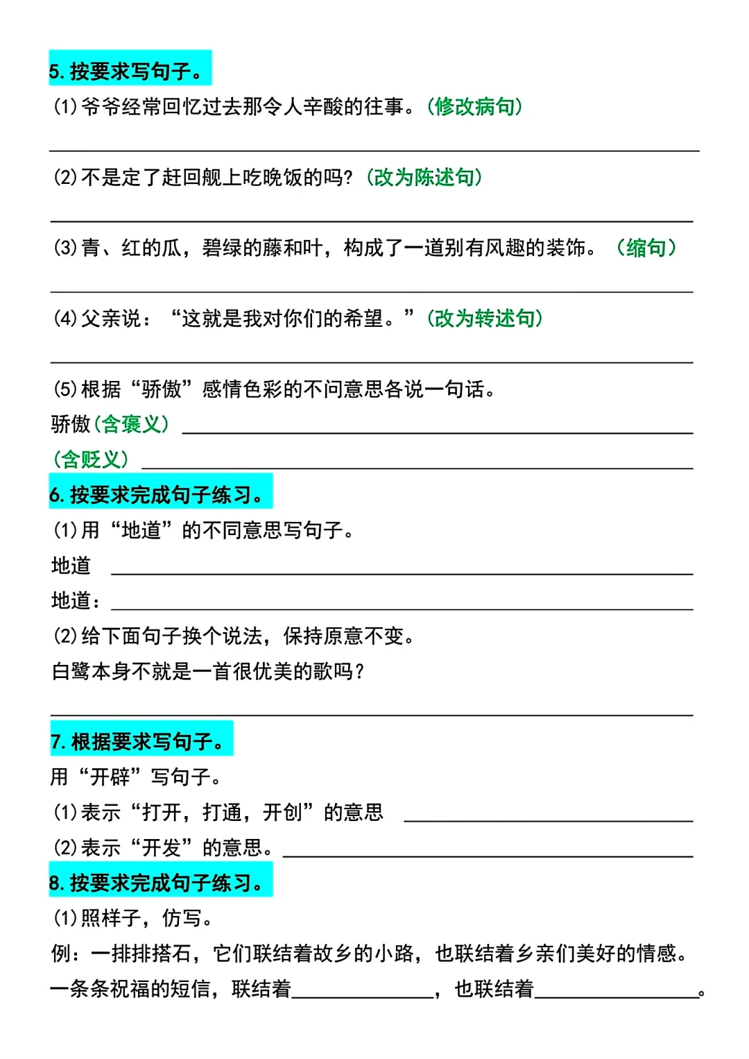 五年级上册语文期中句子专项练习