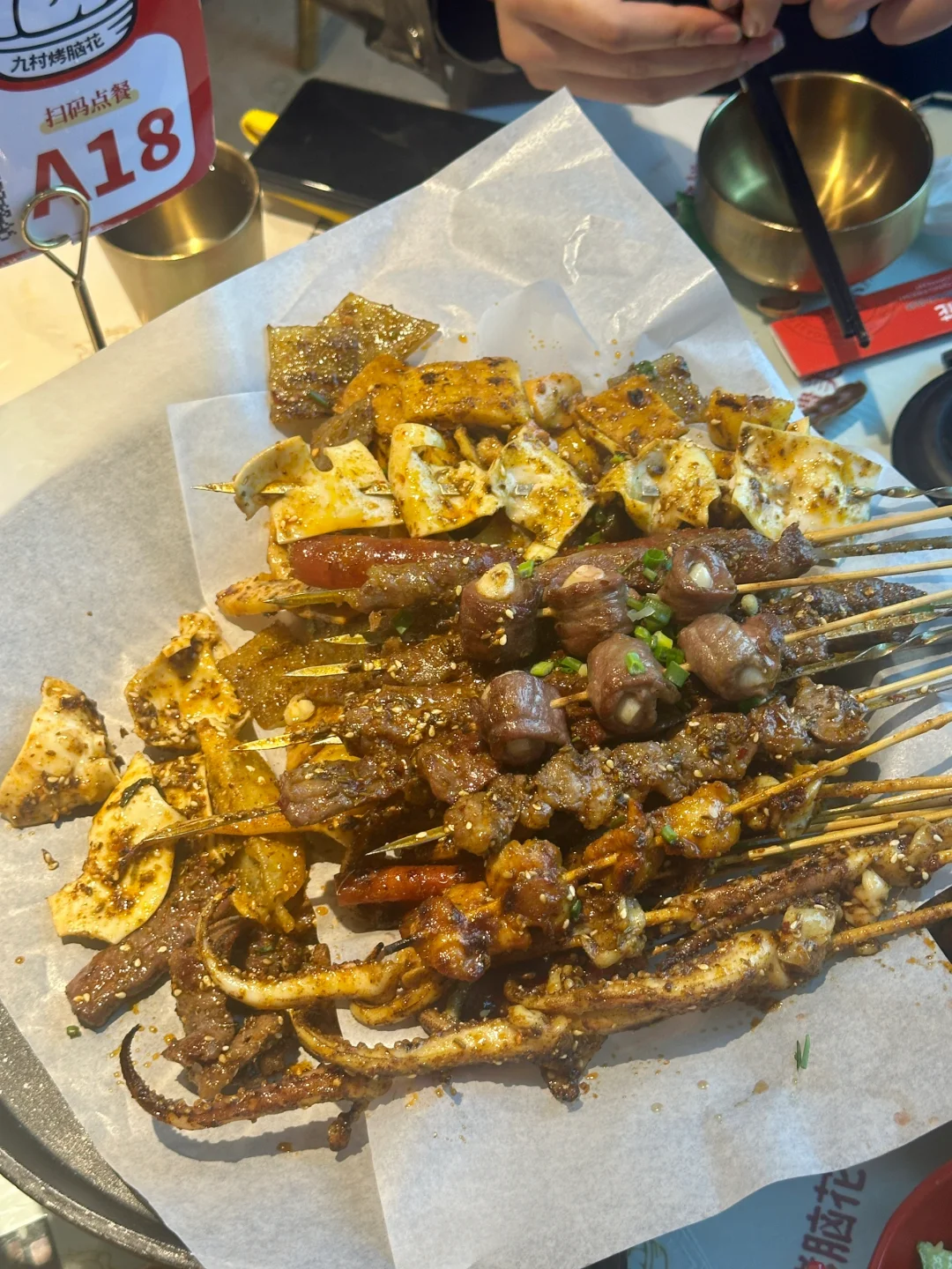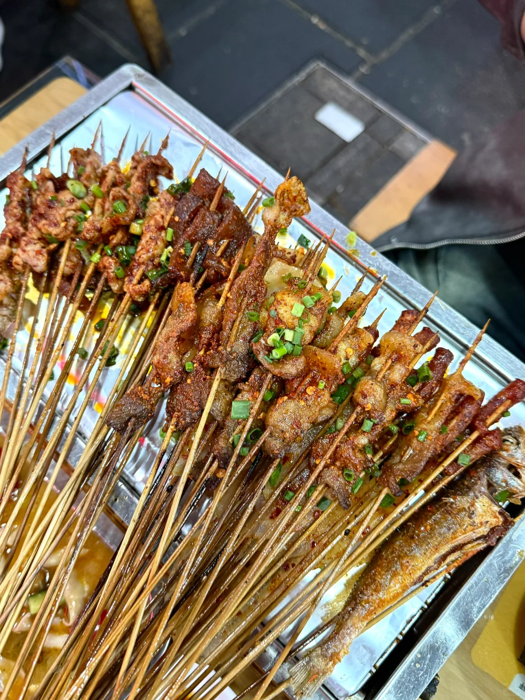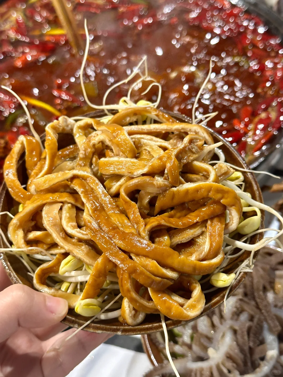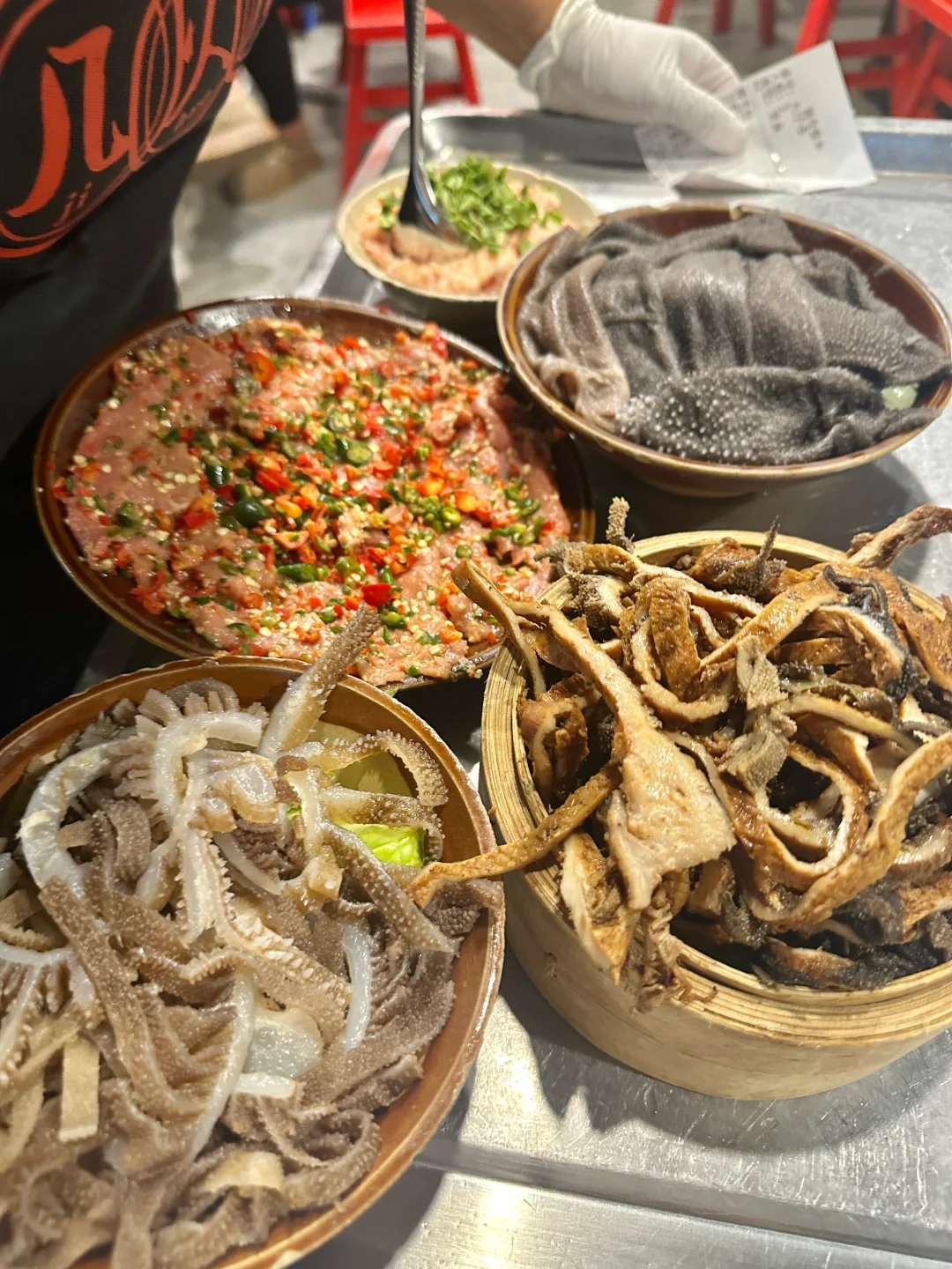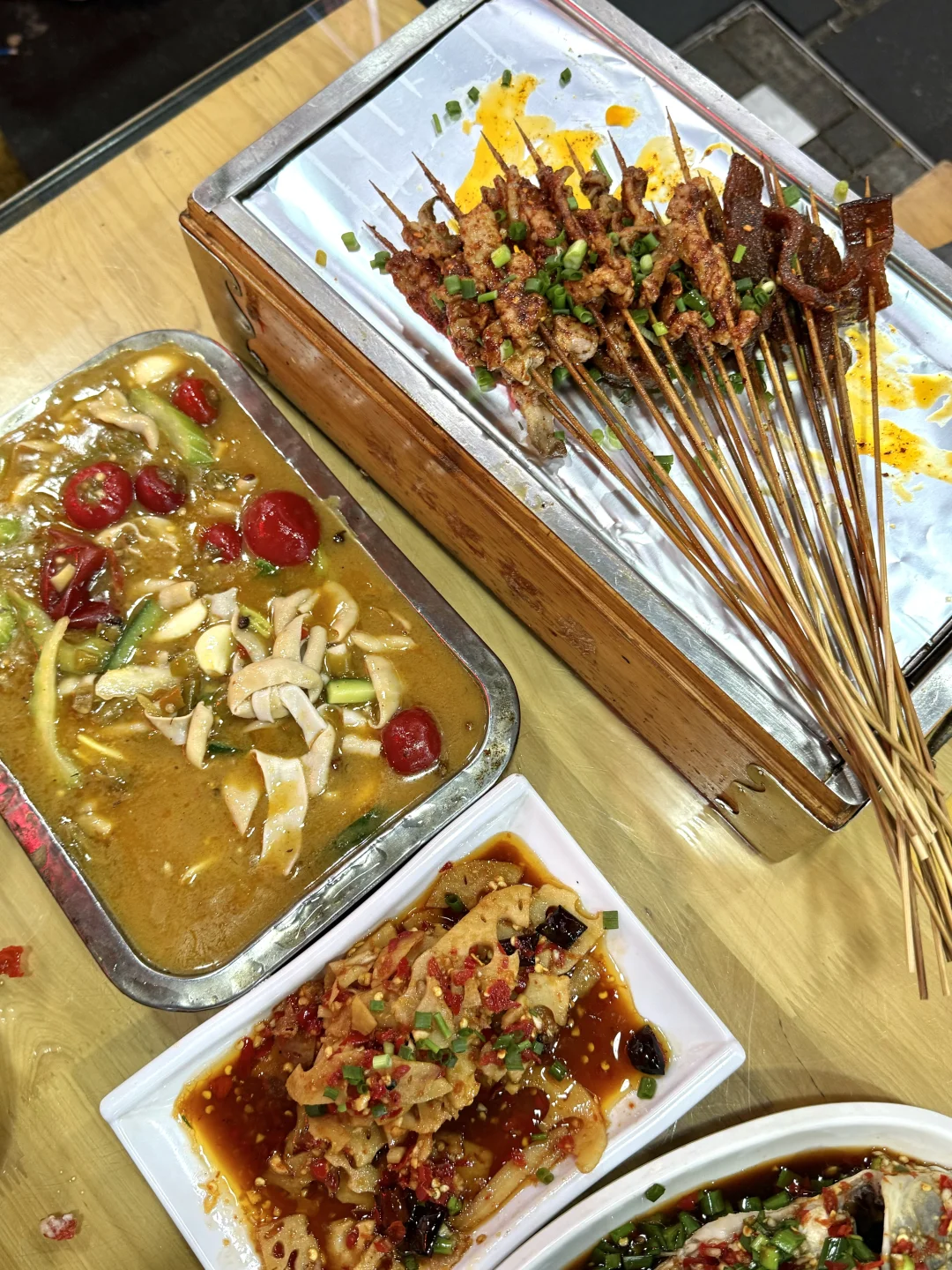 本地姐妹种草的,连吃了两天晚上,在解放碑算好吃的店了!凉拌鲫鱼尊嘟好吃,贼入味,嫩嫩的一点🐟腥味都没有~藕片也好吃,泡椒鸭肠还行,烧烤口味比较重,猪鼻筋猪皮五花肉都不错⭐