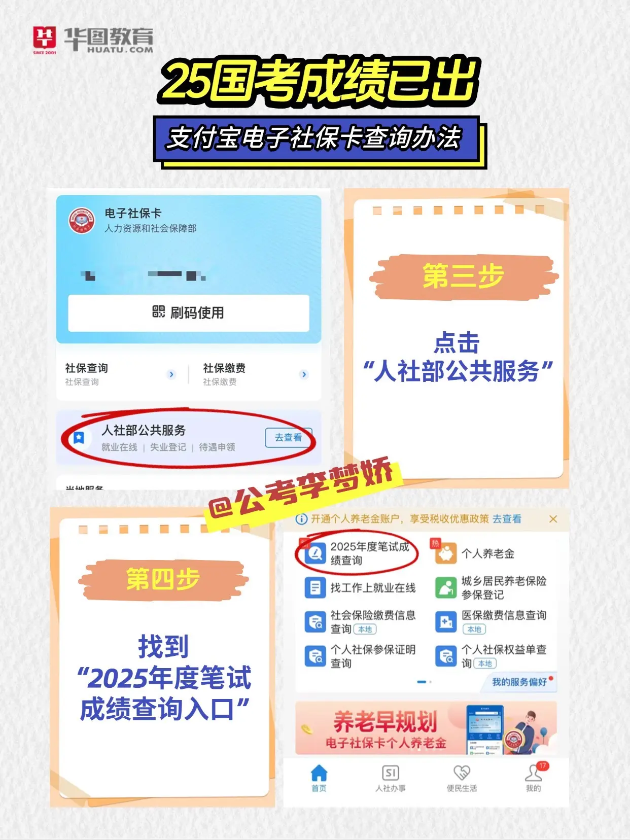 国考成绩zfb也能查🥹按照这五步走❗️。1️⃣搜索电子社保 2️⃣电子社保卡 3️⃣人社部公共服务 4️⃣2025年度笔试成绩查询 5️⃣输入身份信息