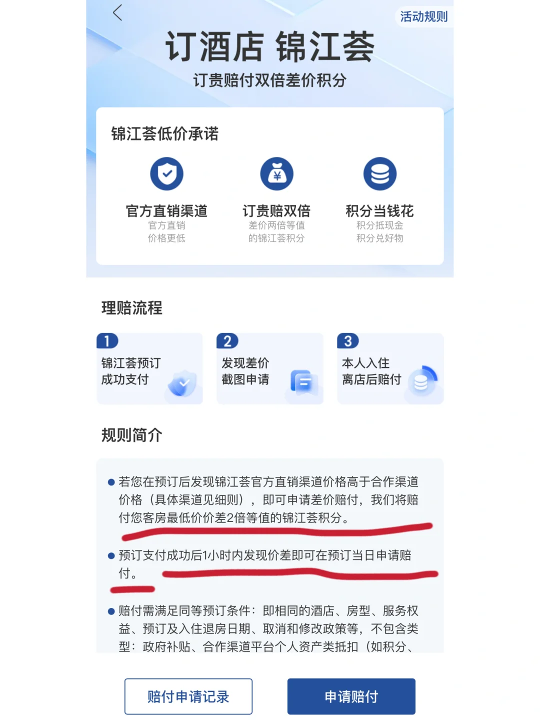 2、 银卡以上会员有一个差价双倍赔付的活动可以关注下:如果在锦江荟预订酒店,一小时内发现其他App价格比锦江荟更低,截图上传就可以获得差额2倍积分赔付哦