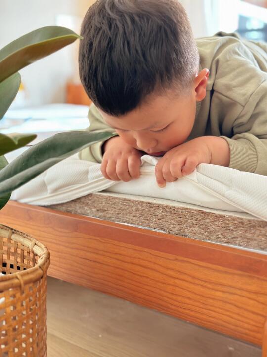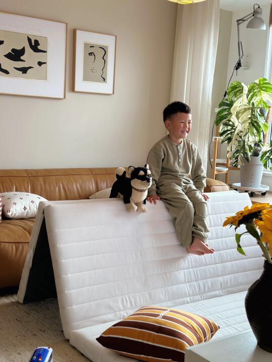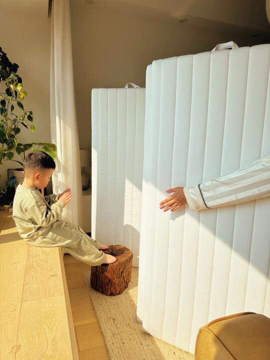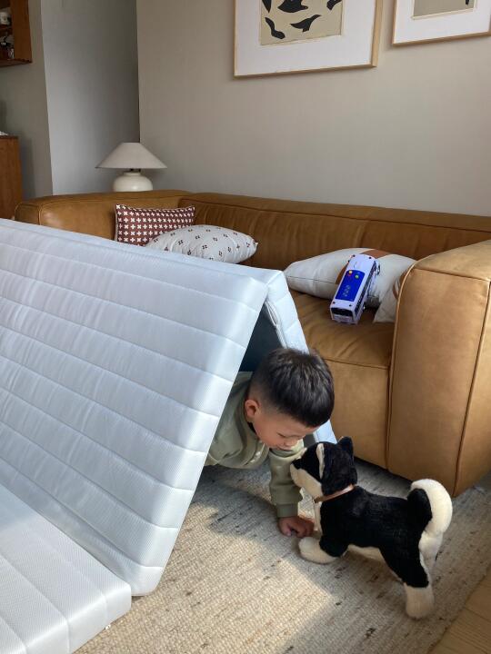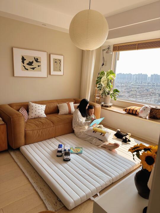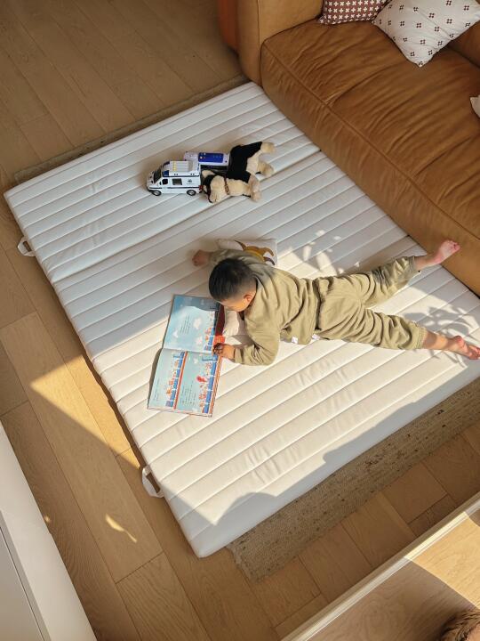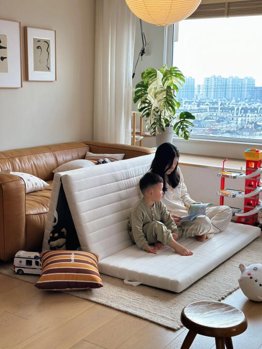 🏠孩子总归是喜欢新鲜感和充满好奇心的,平时我经常把床垫搬到客厅,折叠起来搭个小房子,很喜欢,蹦来蹦去也很安全,有时候看着看下书都很方便
