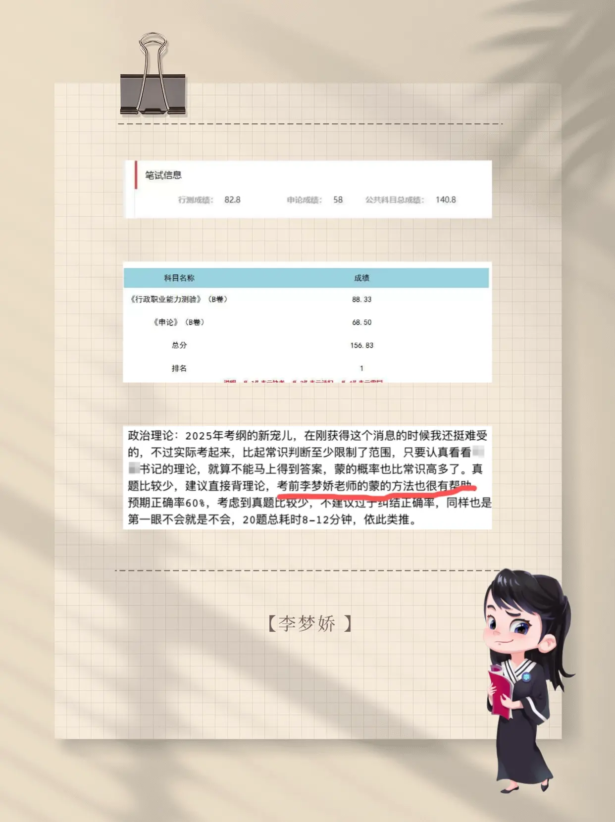 感谢亲学生上岸心得分享。感谢亲学生上岸心得分享,国考笔试140.8岗位第一,省考笔试156.83岗位第一。还专门委托我把上岸经验分享给大家,希望对正在备考的童鞋有帮助。梦娇老师祝福你一举上岸揽星河,前程似锦绽芳华。大家都来沾沾喜气吧。