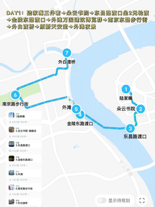 DAY1:陆家嘴三件套→朵云书院→东昌路渡口坐2元轮渡→金陵东路渡口→外滩万国建筑博览群→南京东路步行街→外白渡桥→原新天安堂→外滩夜景