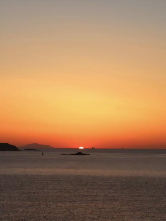 房间正对大海,清晨在阳台上看海上日出很美呀