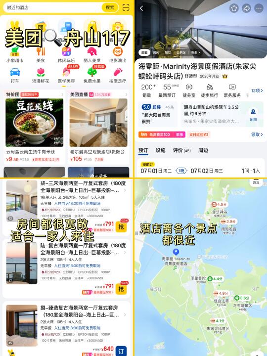 可以在美团搜【舟山117】就能找到这家店!!马上就是暑期旺季了,打算去舟山的的宝⼦建议提前在美团上订酒店,尤其是必住榜酒店,体验了⼏次之后都感觉没踩过雷,而且mt 上经常是 7-8 折,点击左下⻆按钮或者搜索【舟山117】可以看到同款!