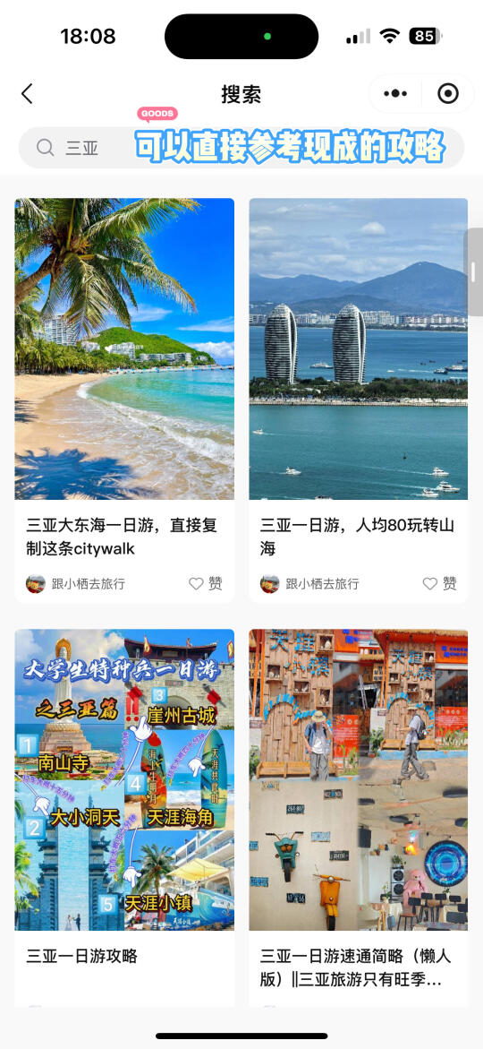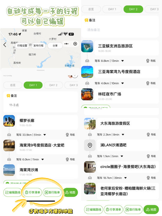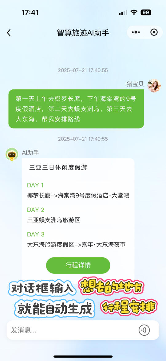 4️⃣三亚也很适合想玩➕吃➕度假一条龙,本j人出去旅游必做攻略,但素这次时间短就懒得研究,直接用智算旅迹AI旅行助手给自动生成了行程安排(1分钟搞定)p人也可以无脑出旅行攻略了,大部分功能都很实用。