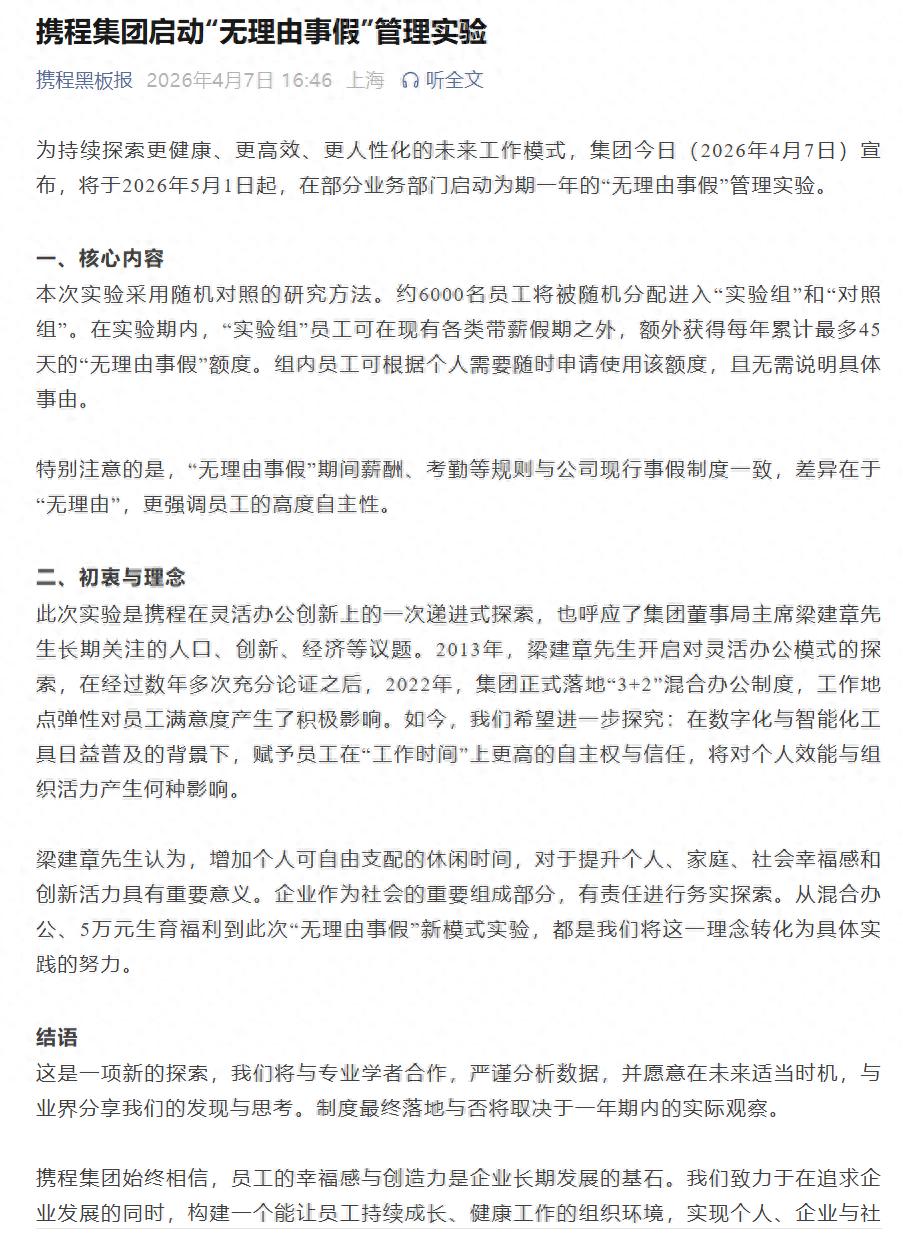 4月7日,携程集团宣布,将于2026年5月1日起,在部分业务部门启动为期一年的“无理由事假”管理实验。