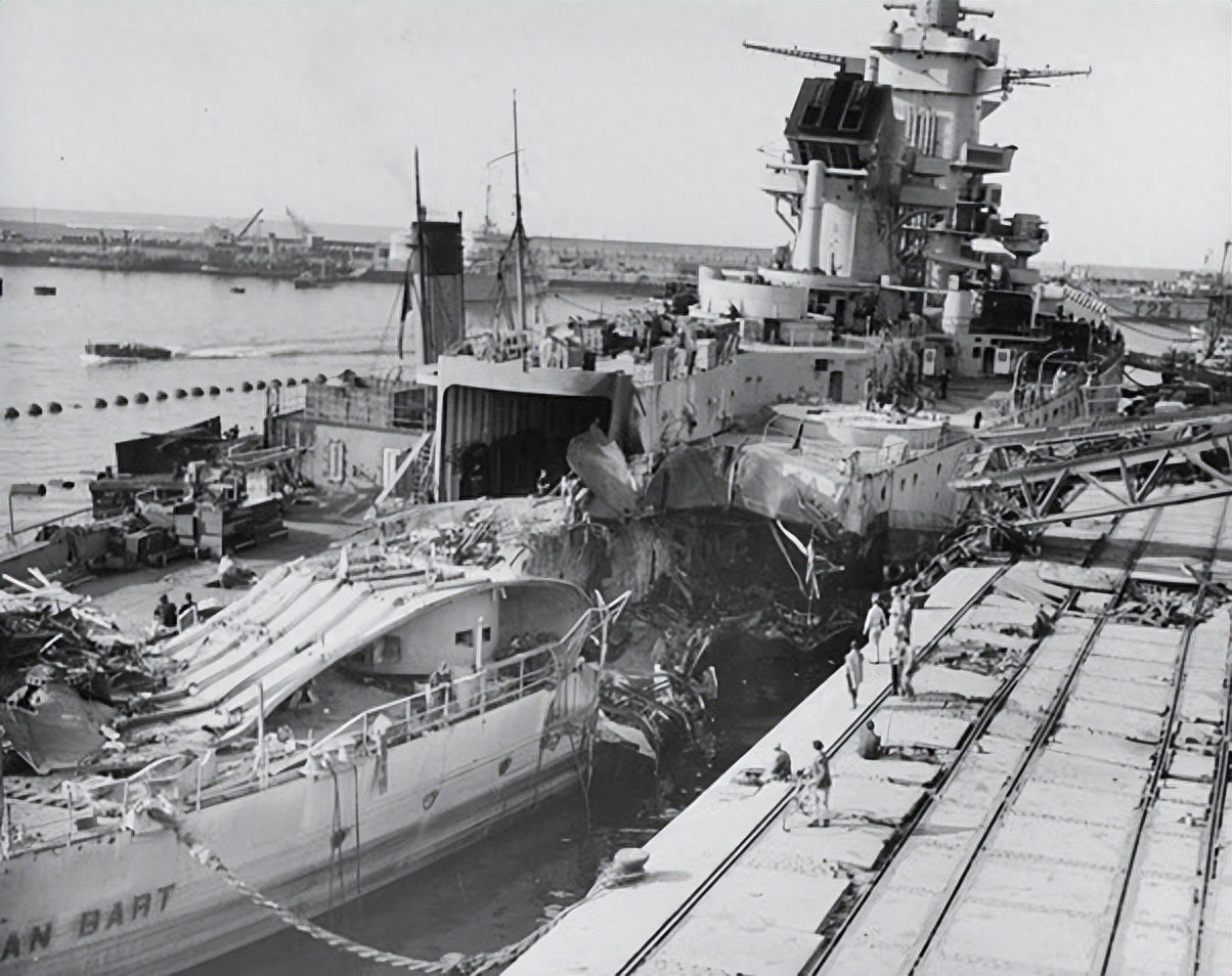 让·巴特号遭受了马萨诸塞号战列舰的炮击以及游骑兵号航母上飞机投掷炸弹所造成的损害。