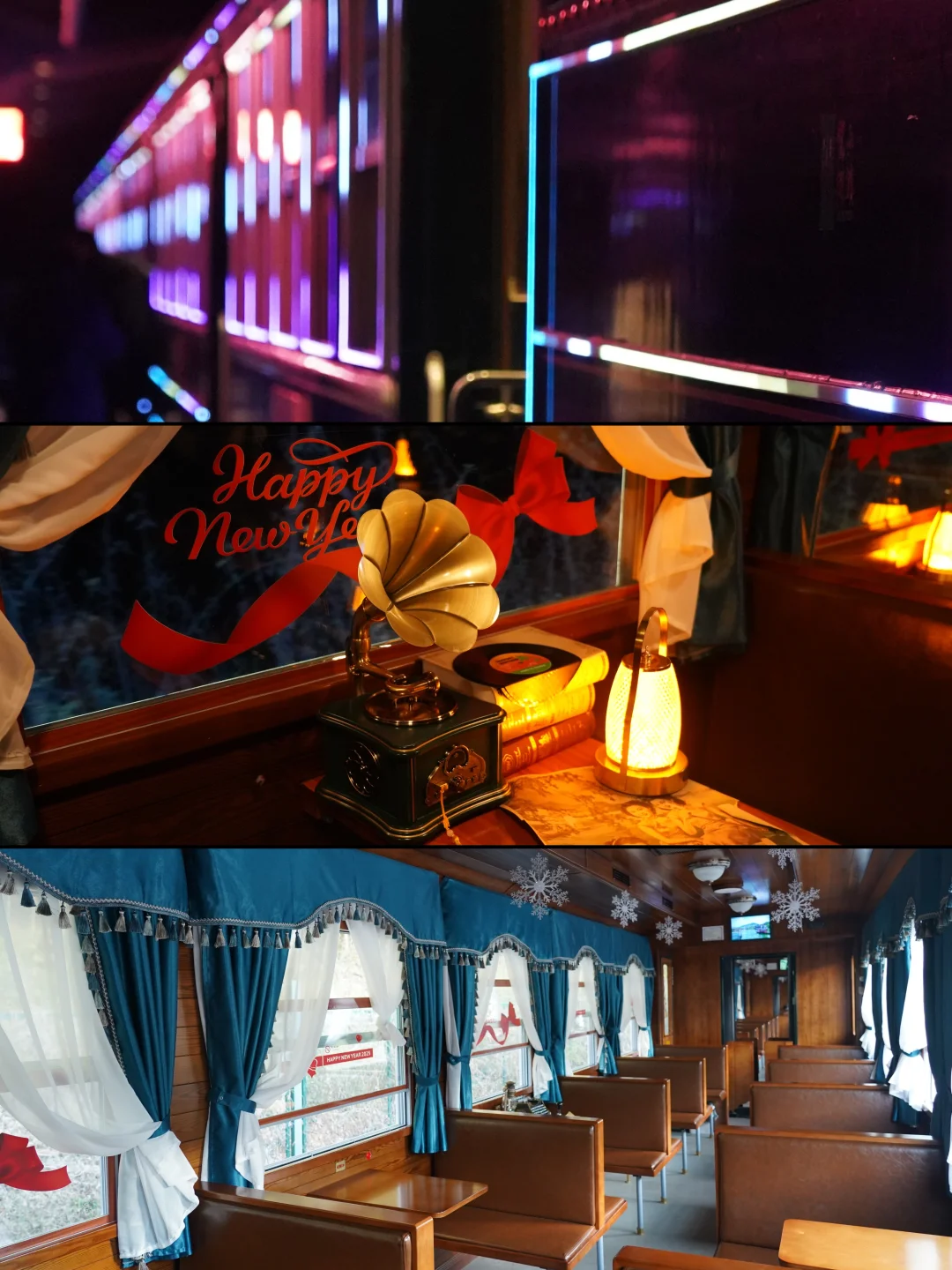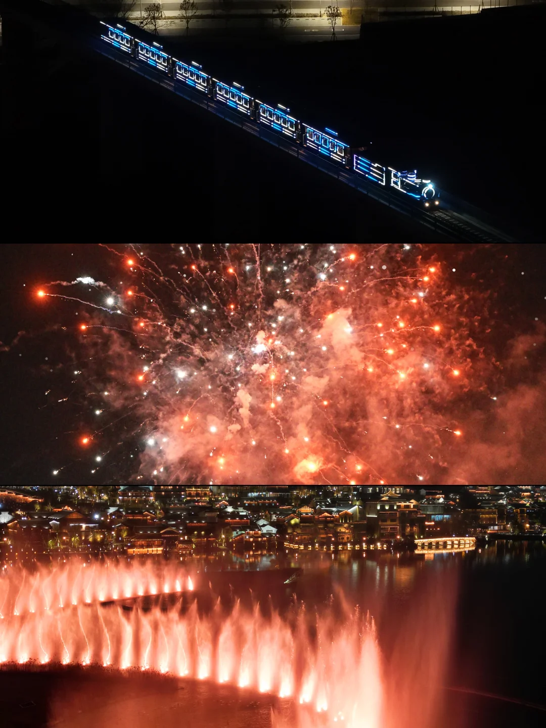 坐着🚆环游小镇,有中间站点可以下车,白天是童话般的云端列车,晚上变身赛博朋克风的水秀烟花专列,可以在车里看着水秀绽放、烟花升空,远处的灯光灿若繁星,真的有过年氛围啦!
