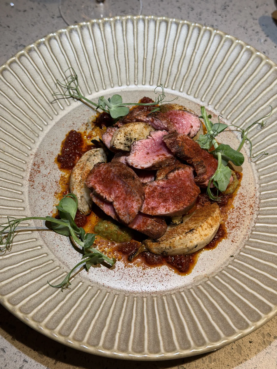 品尝了几个特色菜,松露舒芙蕾很有特色,下面是炖煮的牛肉,因为是小食所以不大。还有这个小披萨芝士浓郁。羊排也是很嫩,没有膻味。整个环境挺干净的,适合来约会。
