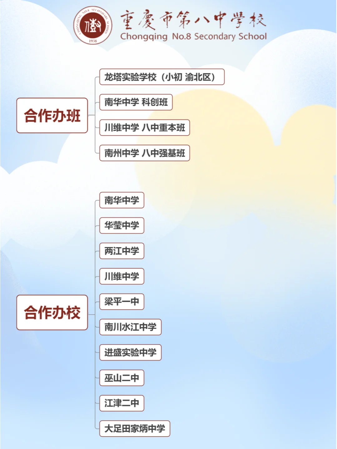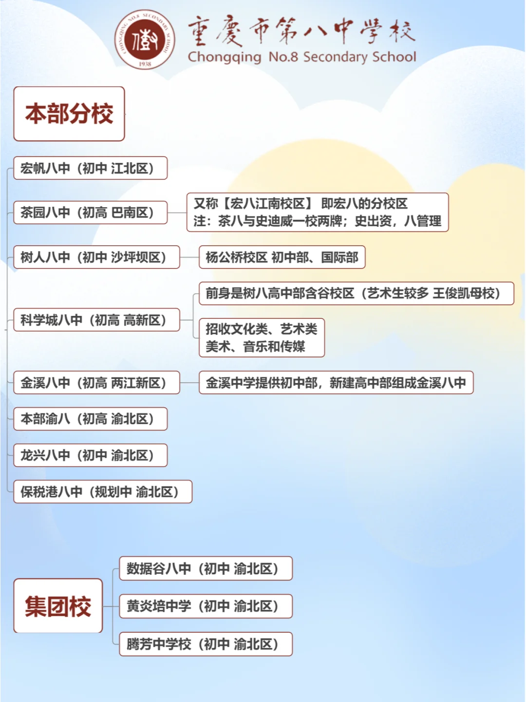 重庆八中作为四大金刚之一,关注度一直很高,校体系也比较复杂,下面按区来重点讲解本部和分校: