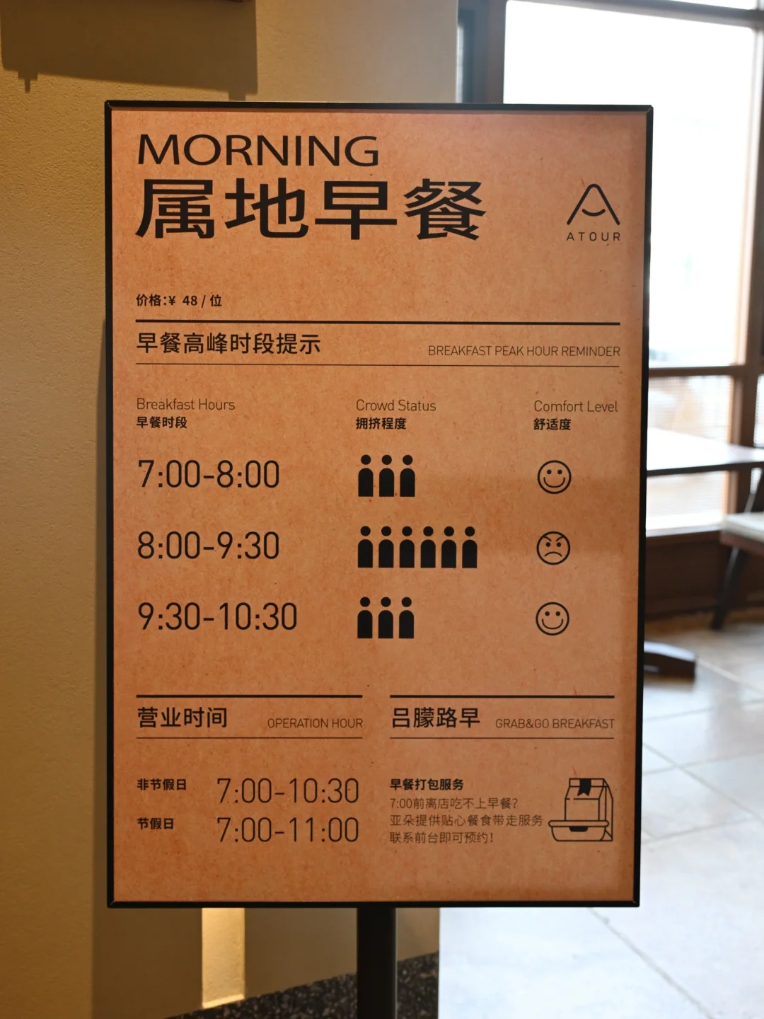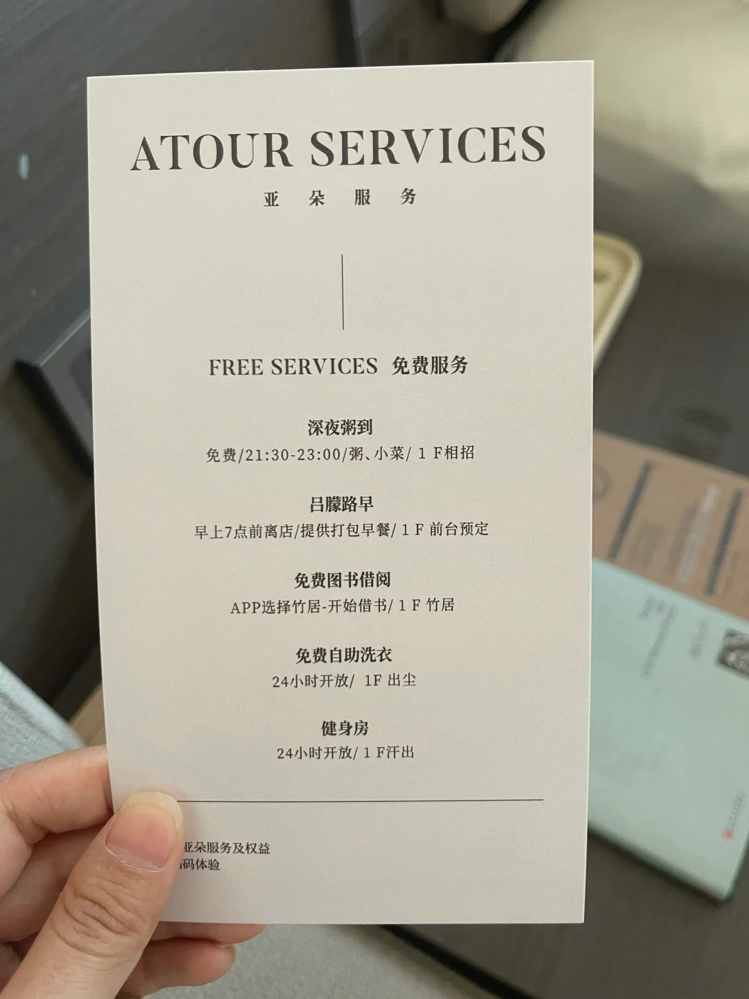 床头还有一张ATOUR SERVICES(FREE)的卡片